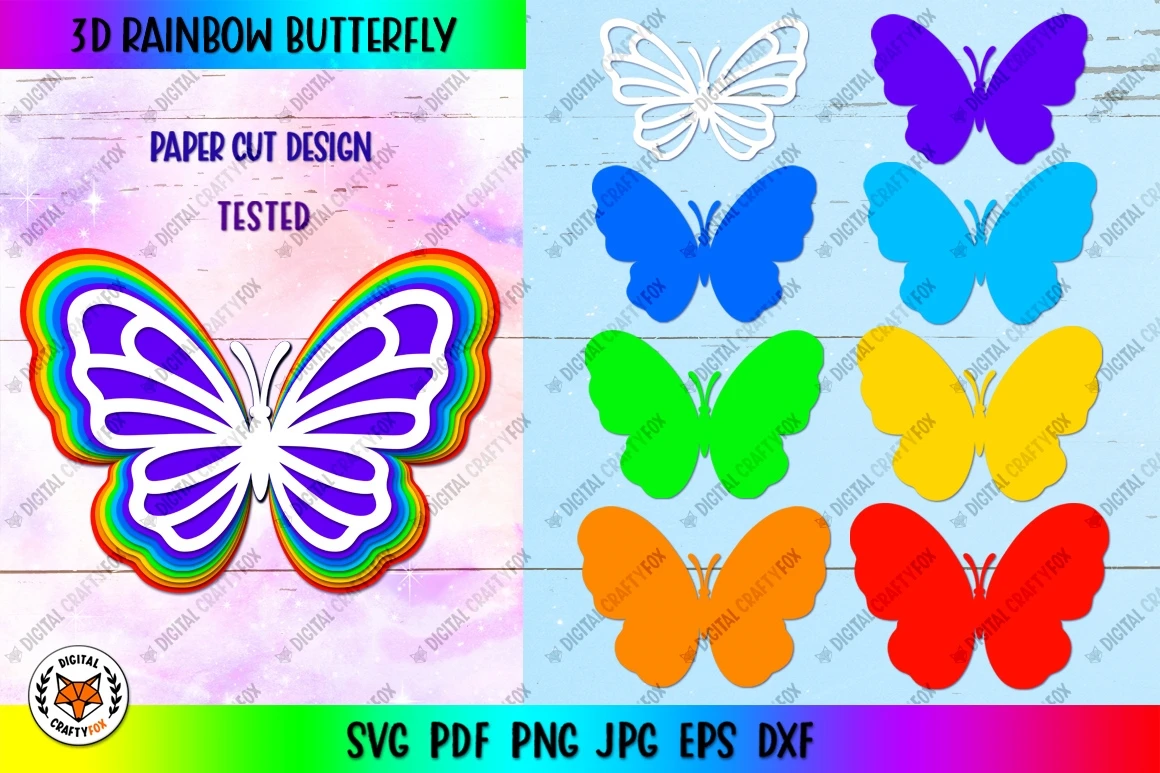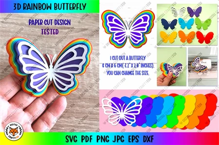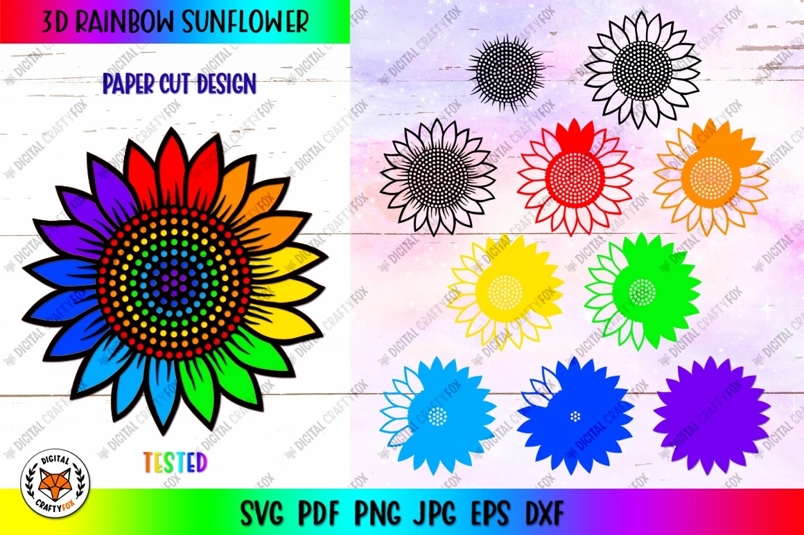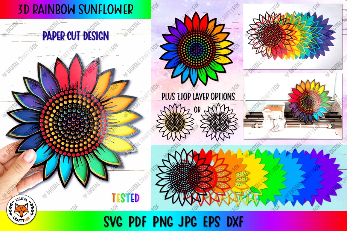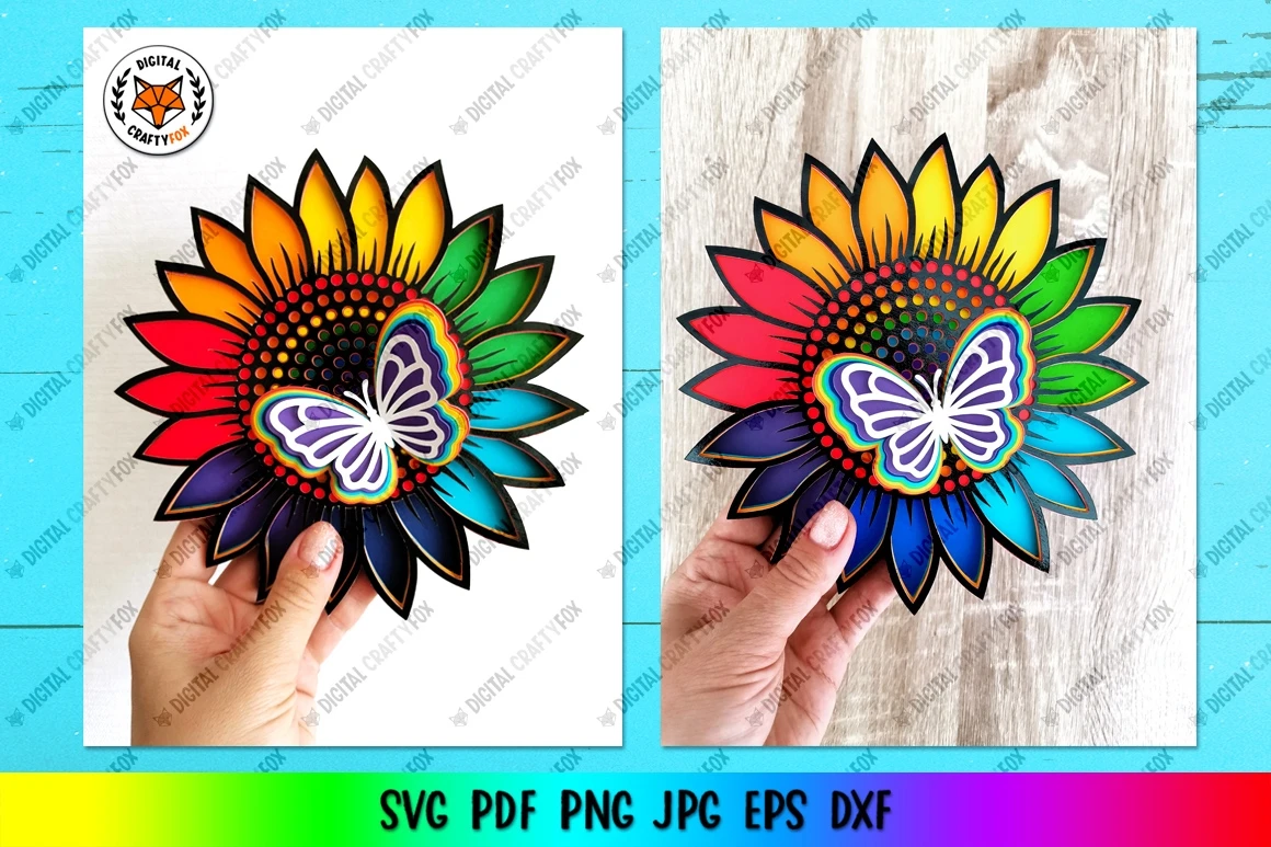 3D Rainbow Sunflower and Butterfly. For cutting and sublimation. 3D paper cut designs.