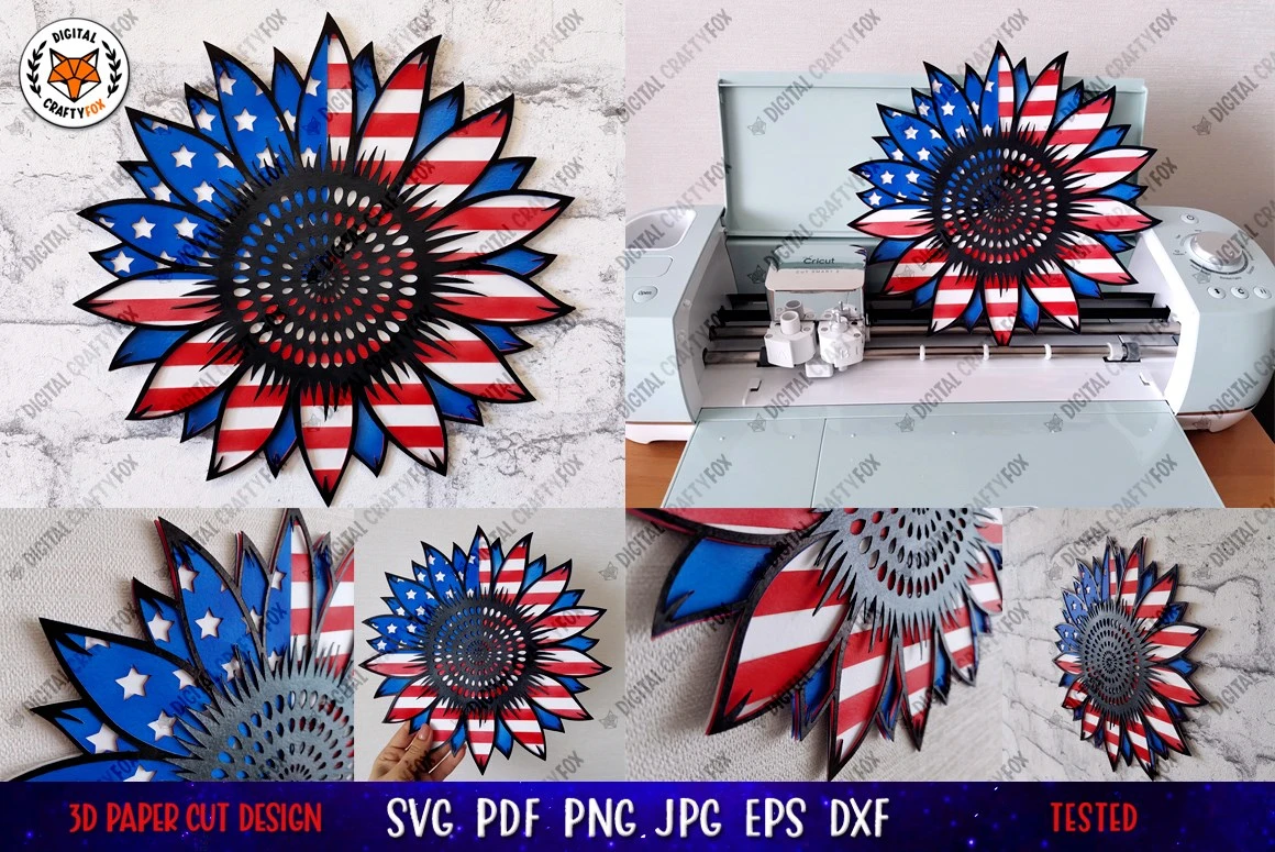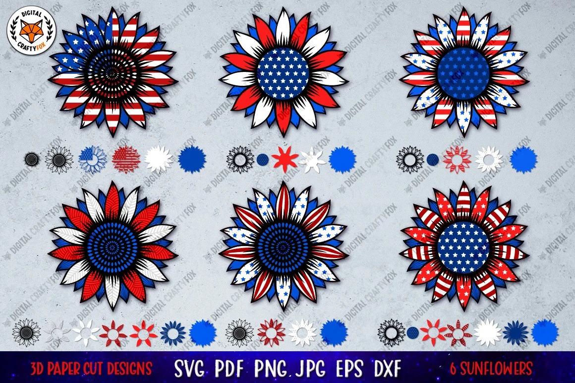3D patriotic sunflower mandala for paper cutting and sublimation on t-shirts, mugs or others surfaces. 3D Layered sunflower. 4 th of July sunflowers.