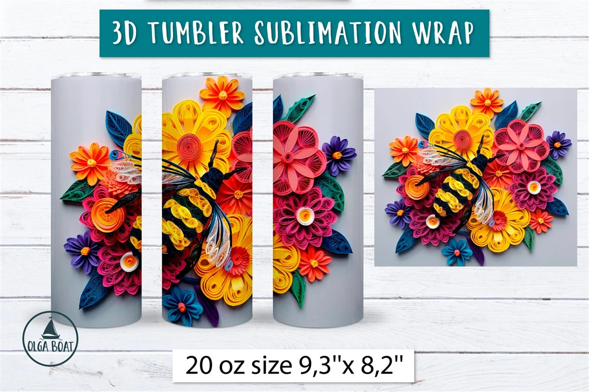 3D Bee and flower quilling design perfect for 20 oz skinny tumbler wrap.