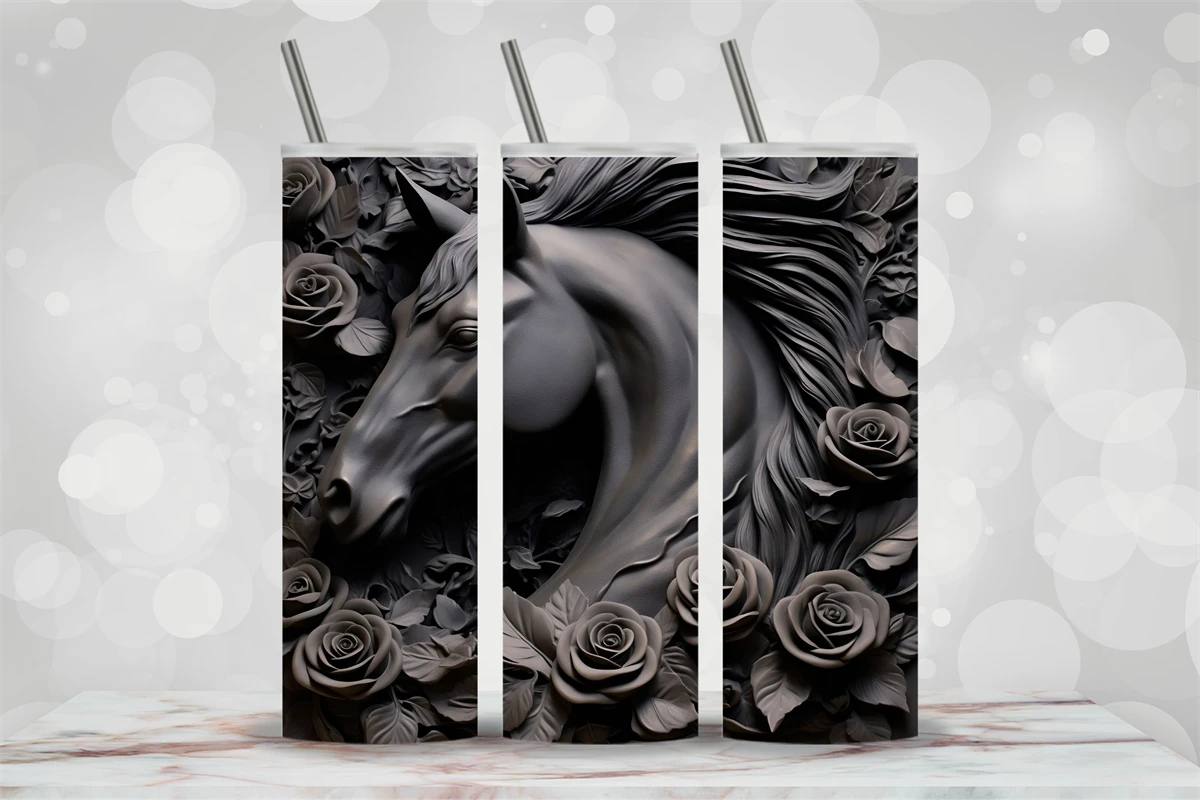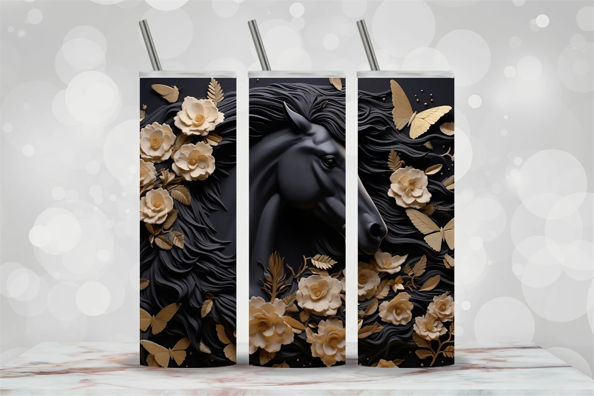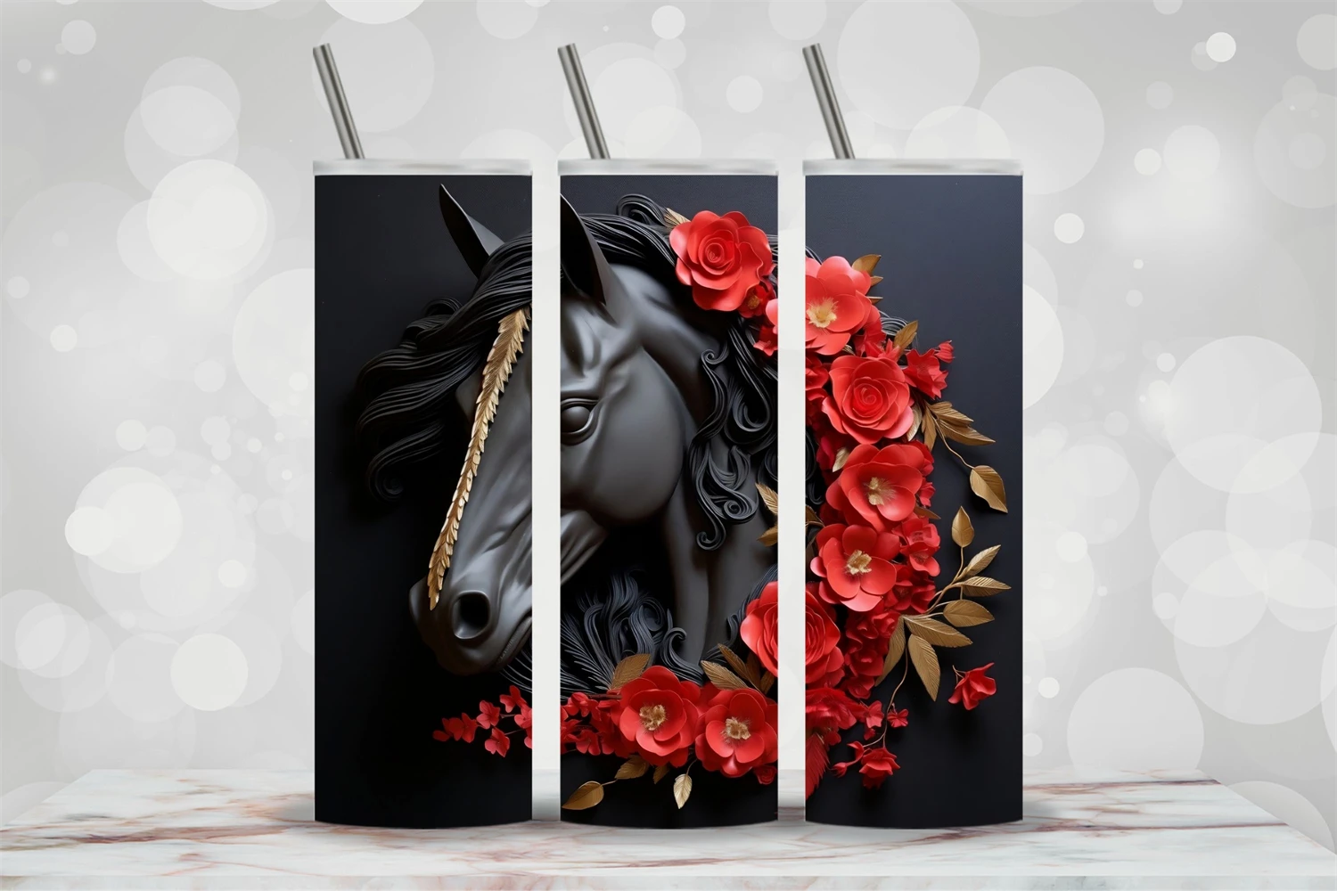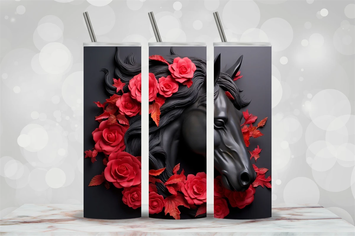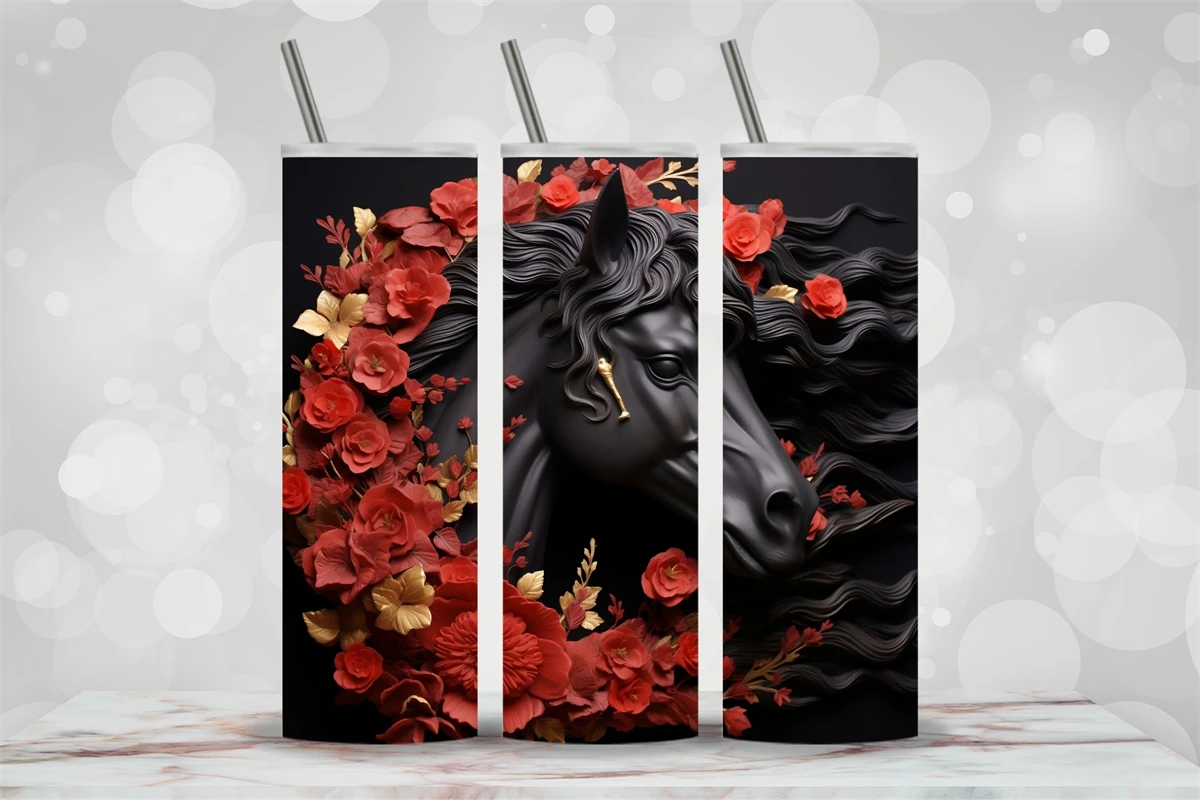 3D Tumbler Wrap Black Horse Flowers 20 oz Skinny Tumbler Sublimation Design.