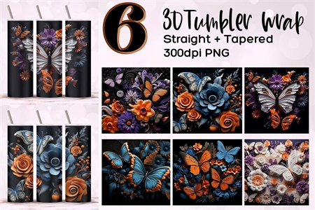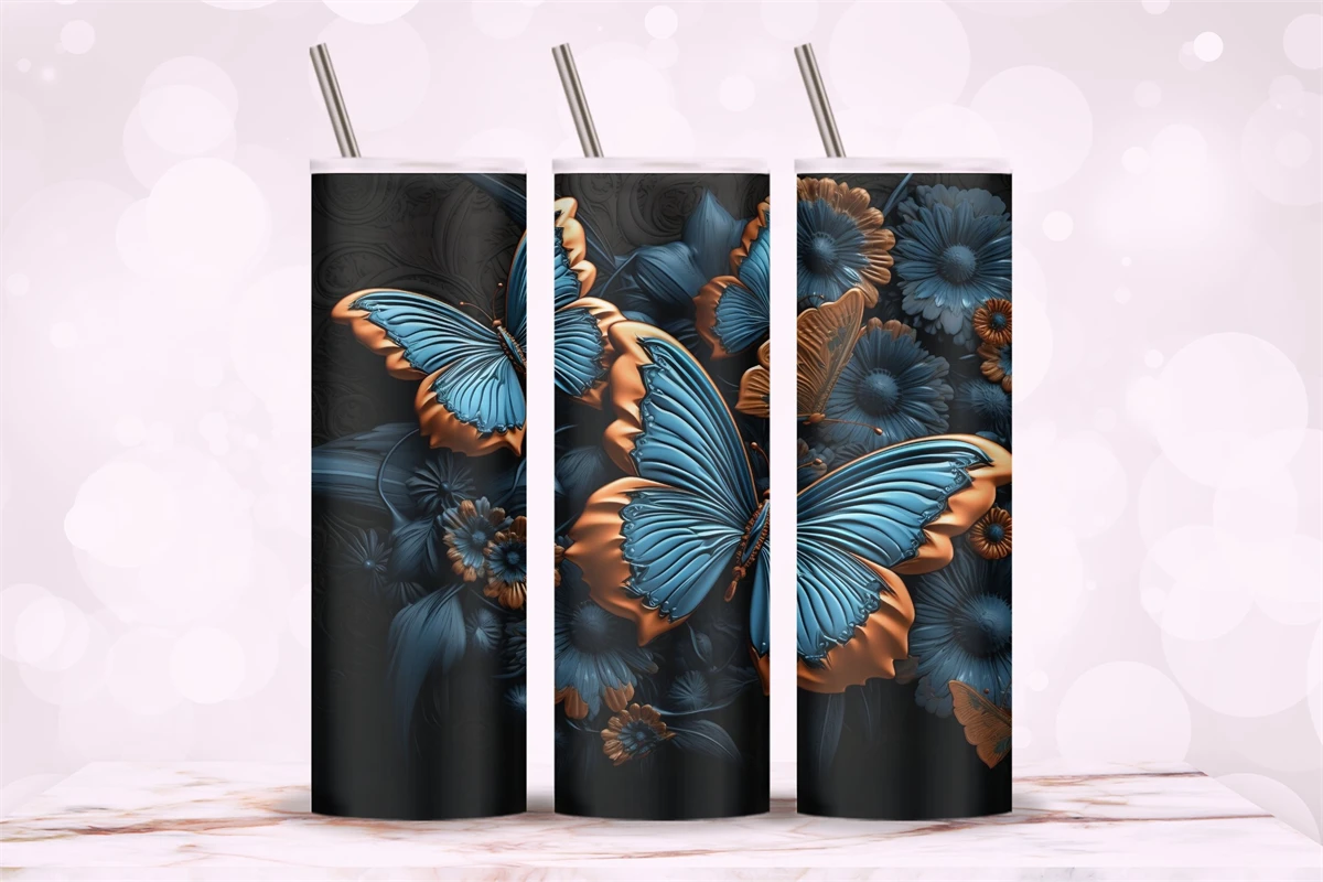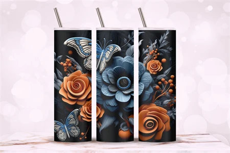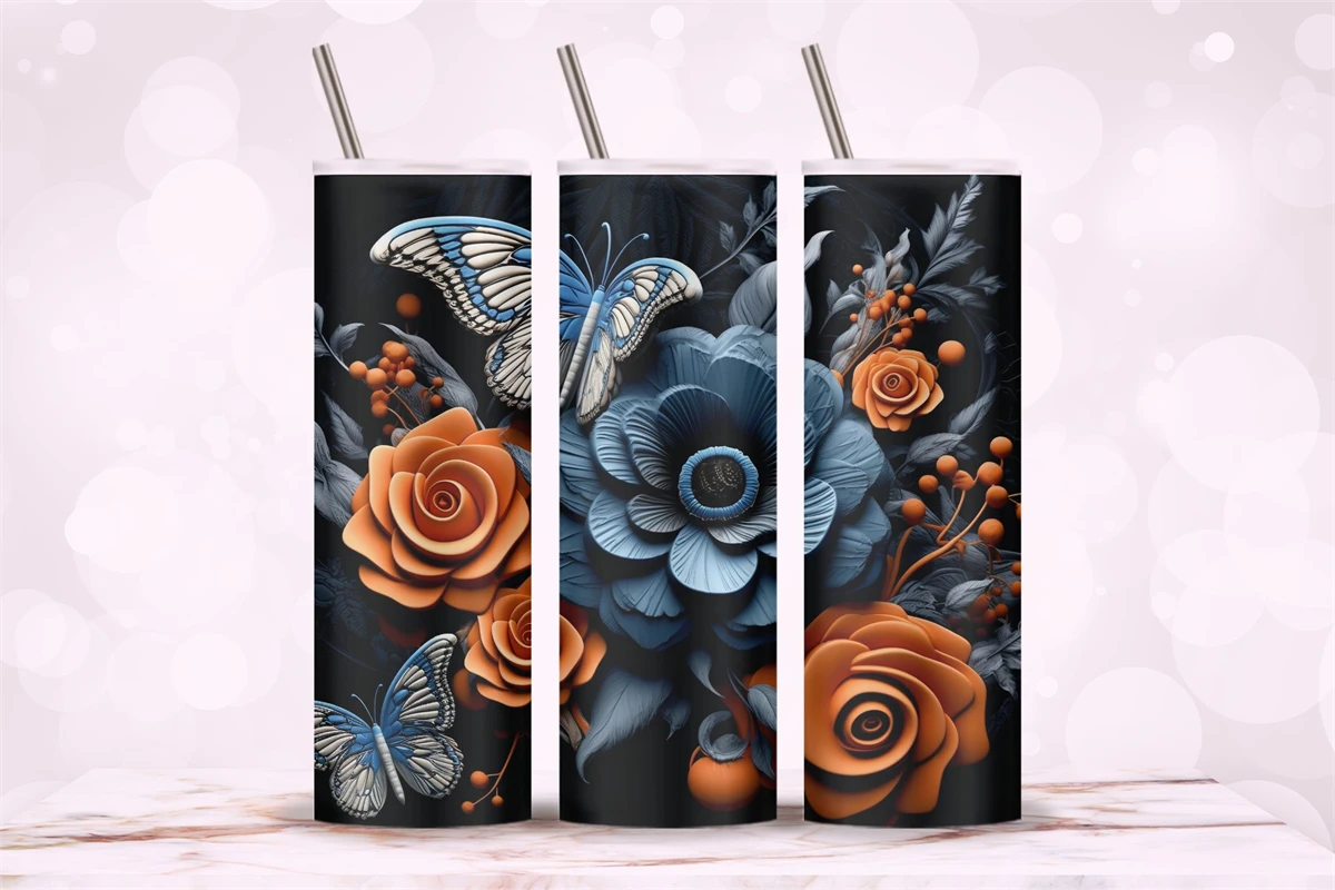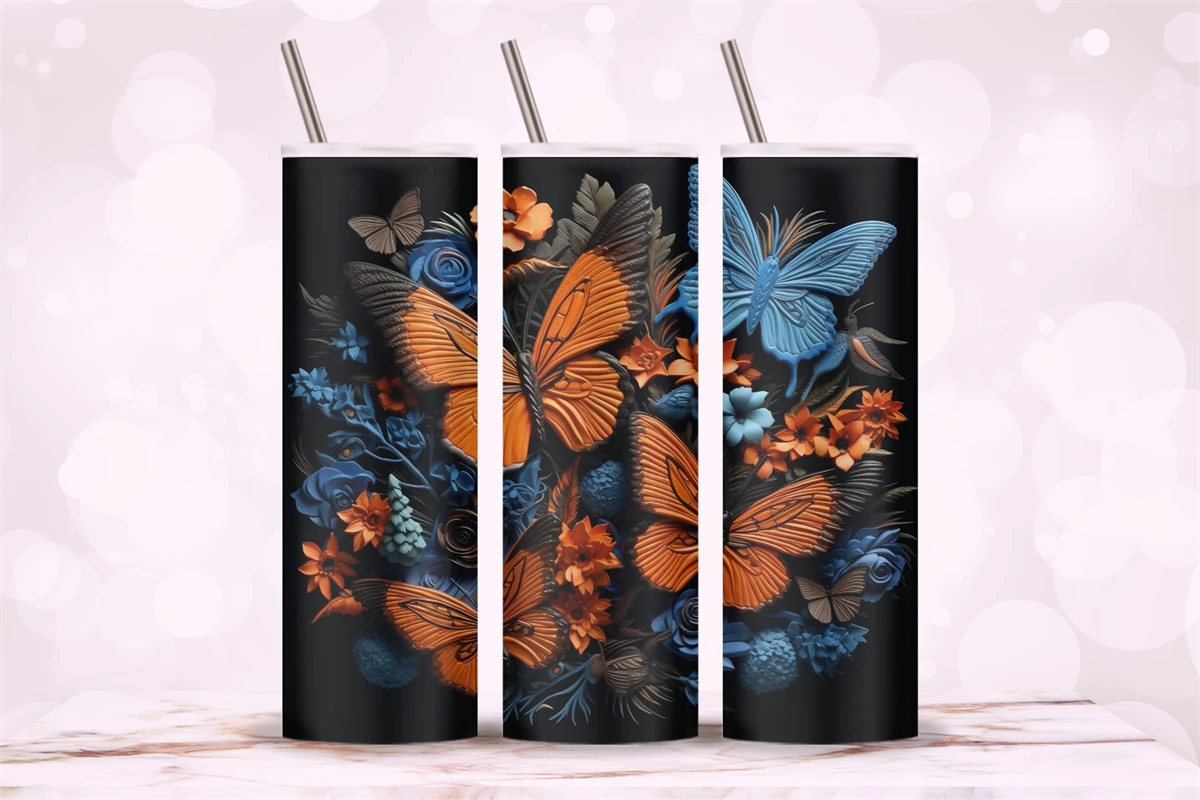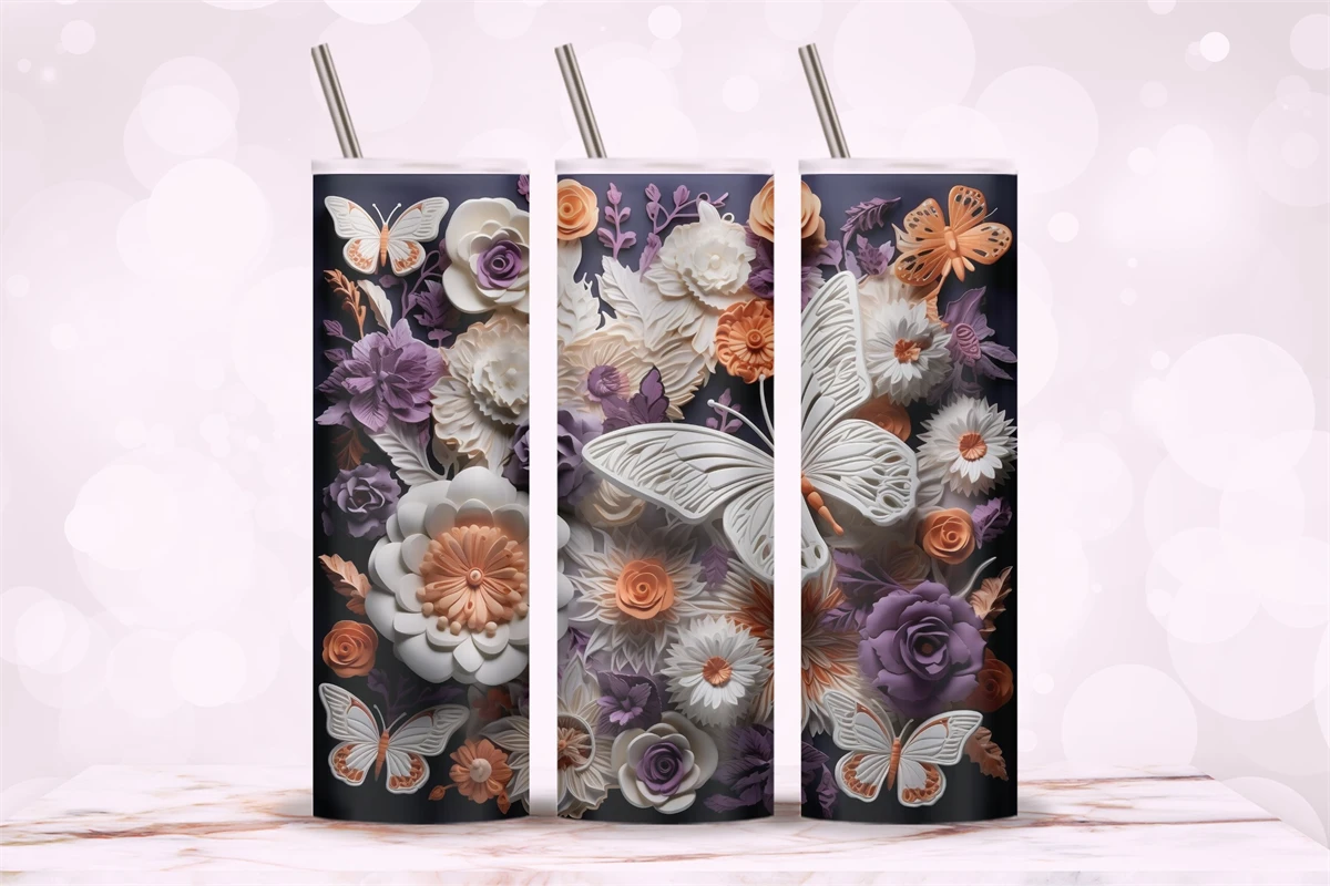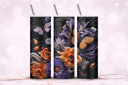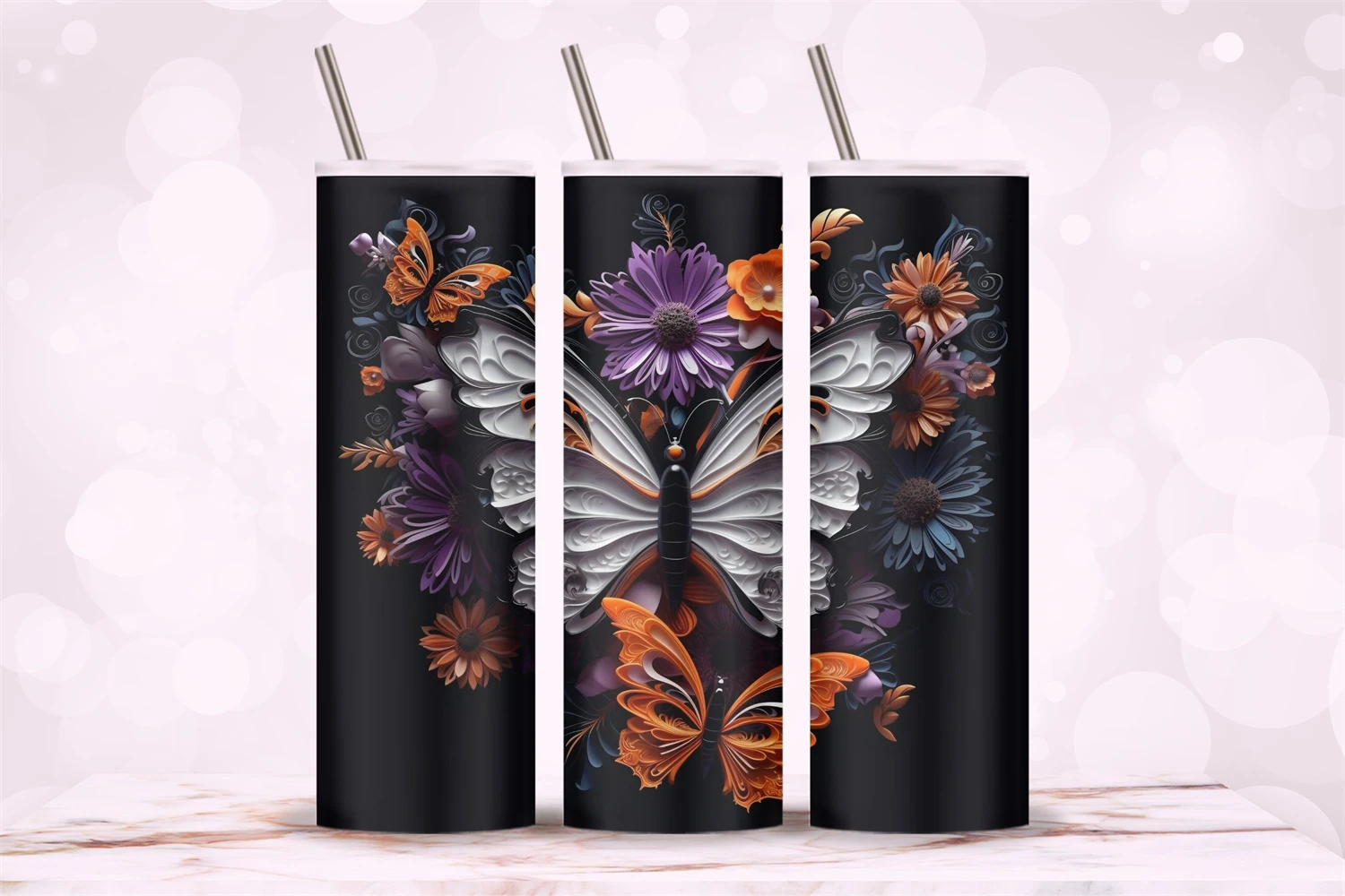 3D Tumbler Wrap Dark Fantasy Butterflies with Flowers 20oz Skinny Tumbler Sublimation Design.
