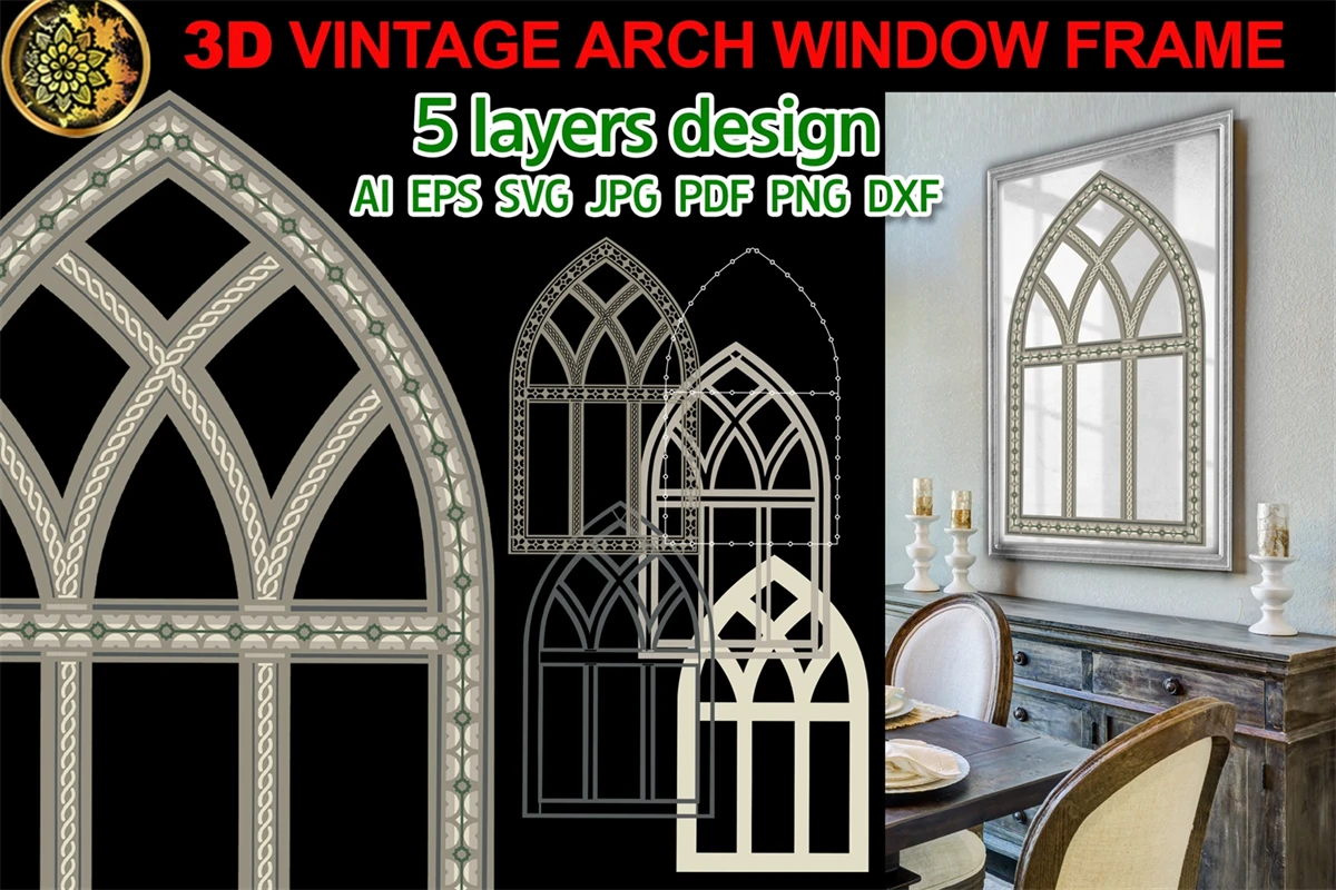 3D Vintage Farmhouse Arch Window Frame Layered Design Clip Art Cut Files for your creative DIY projects, and Home Decorations. Perfect for vinyl, personalized T-shirts, apparel, cups, stickers, card stock, and other DIY projects. Options are endless! Designs come in a black color version for easy to change the color as your choice, and a colored version for easy and ready to use.