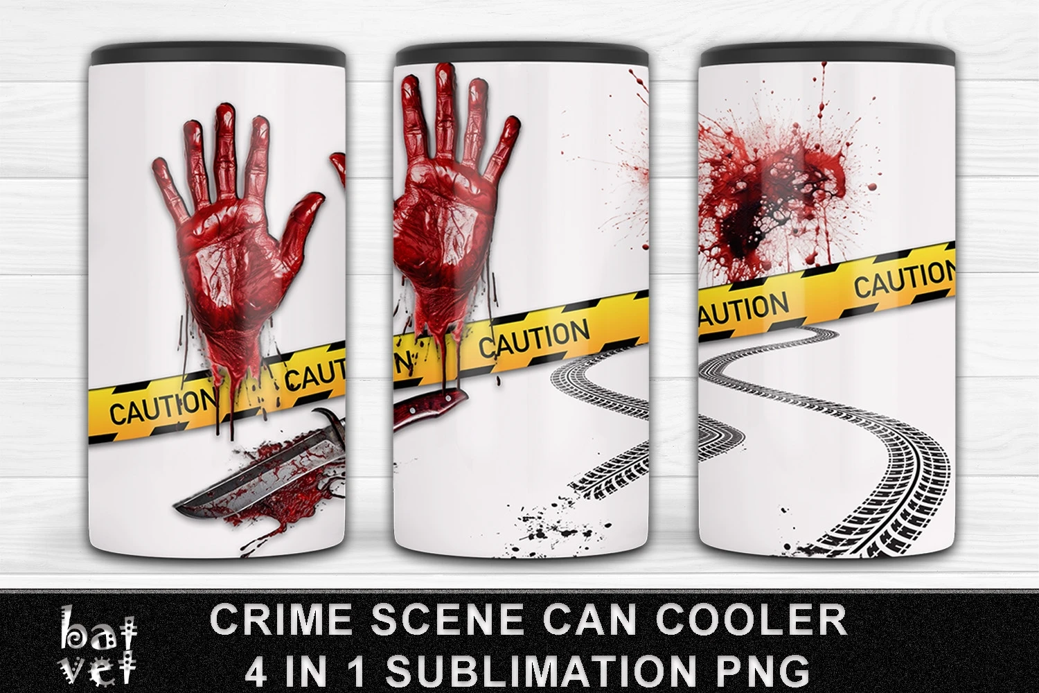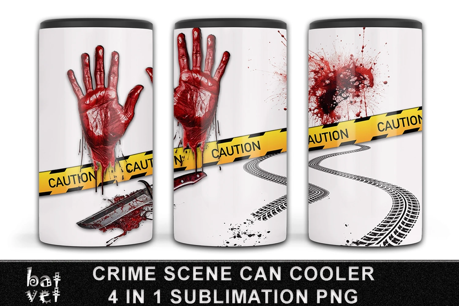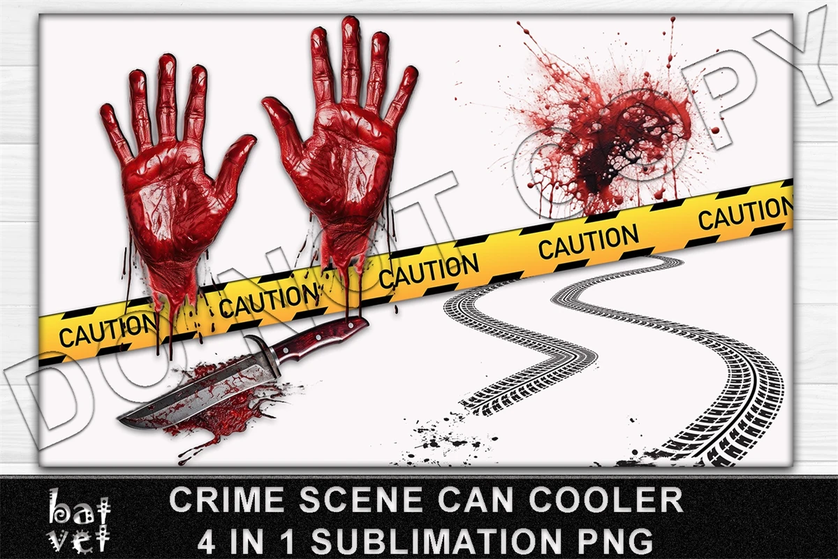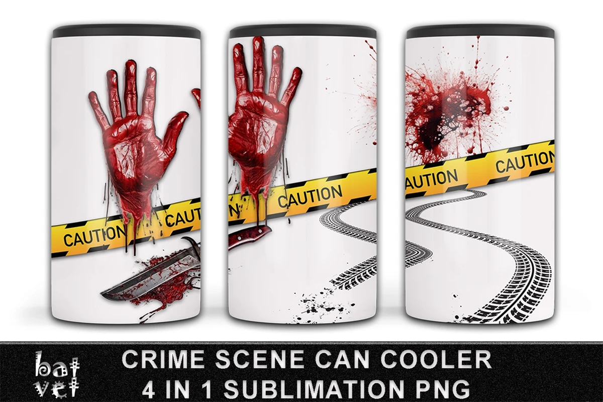 True Crime Can Cooler PNG, Bloody Hands, Bloody Knife, Crime Scene Tape, Car Tracks, Blood Splatter Sublimation.
