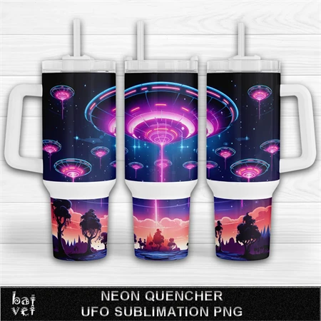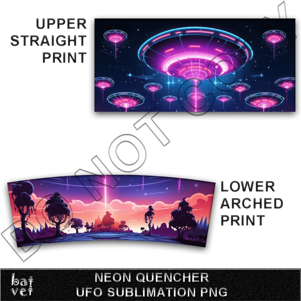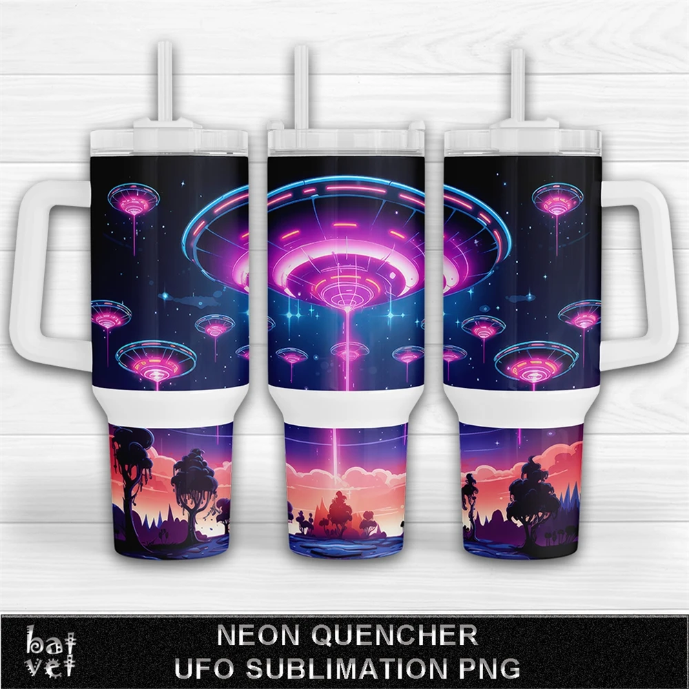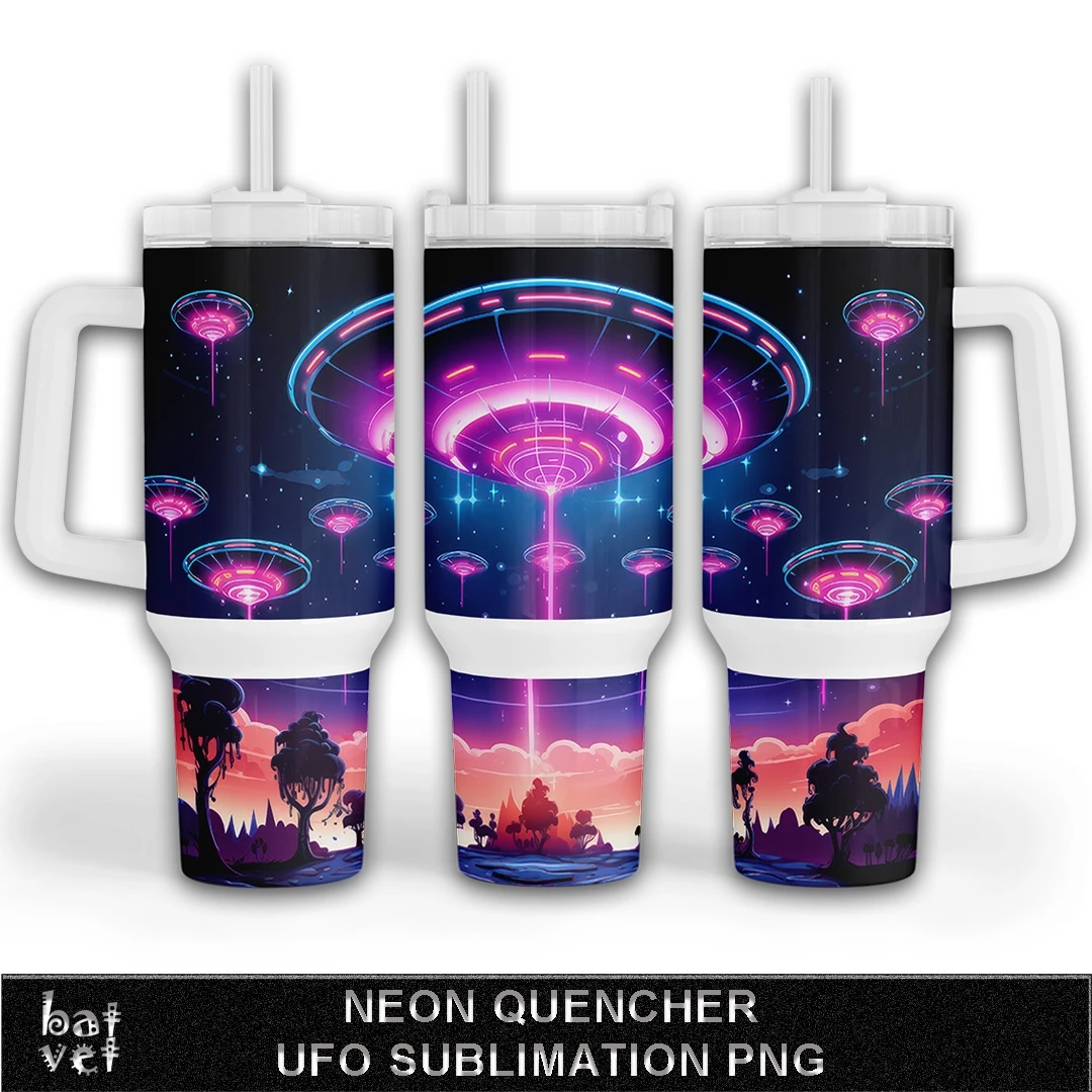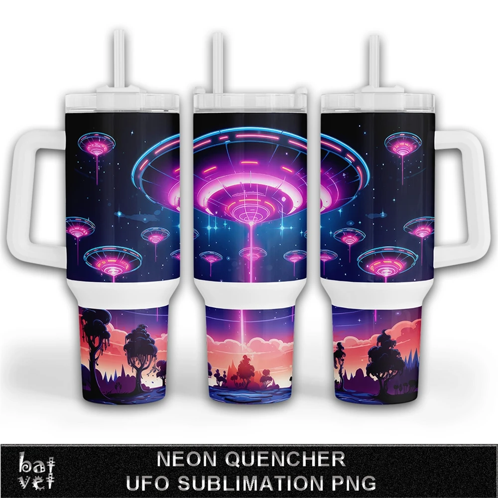 UFO Tumbler 40 Oz Quencher Neon Print, Flying Saucer Sublimation Wrap. Two Part Sublimation - Upper Straight and Lower Arched Print.