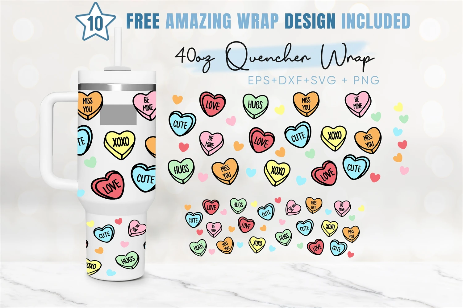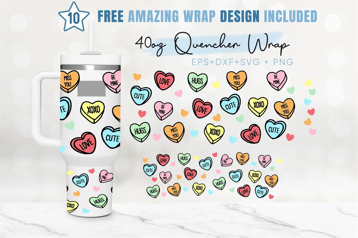 40oz Candy Heart Quencher Tumbler, Happy Valentines Svg