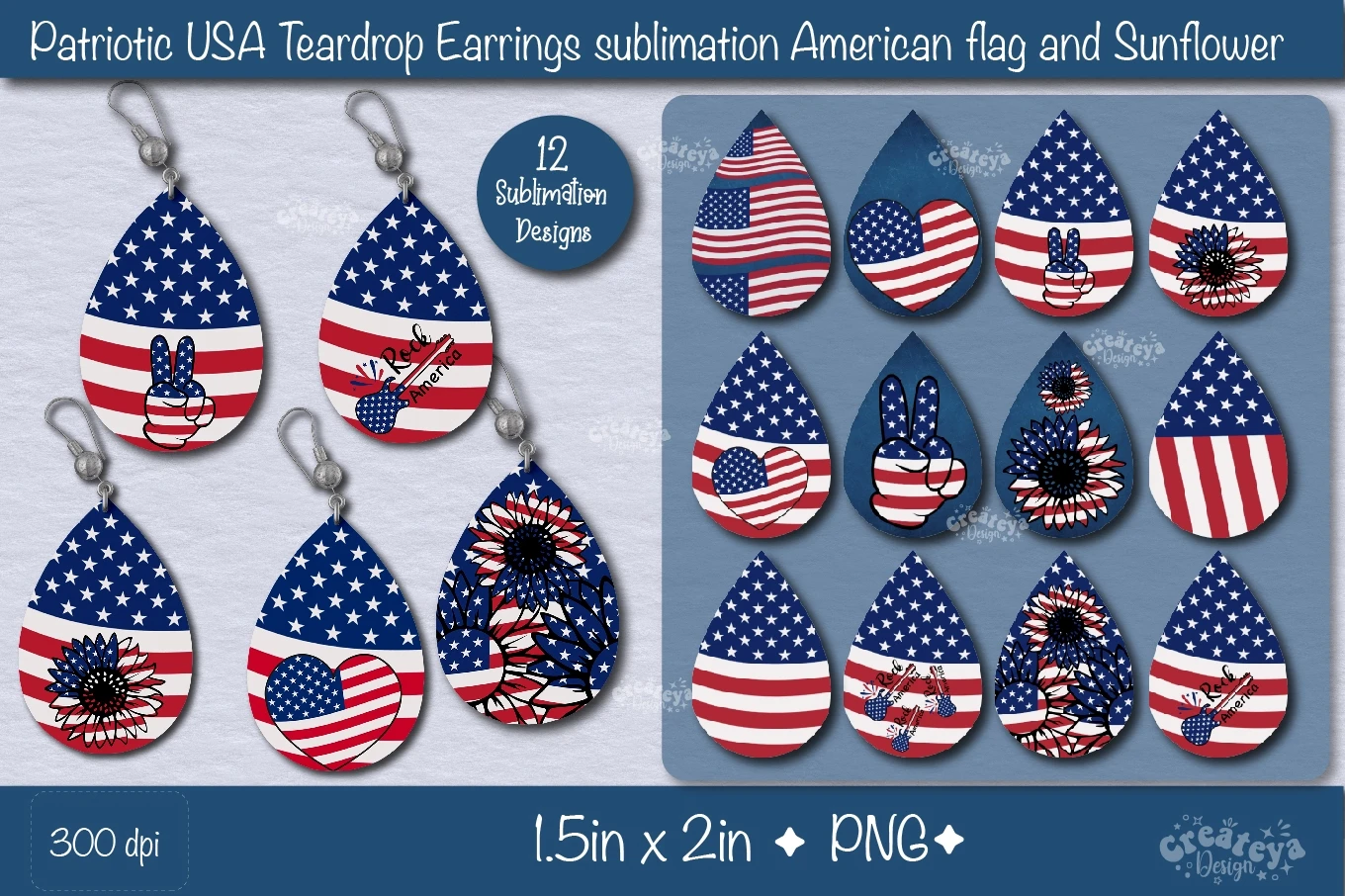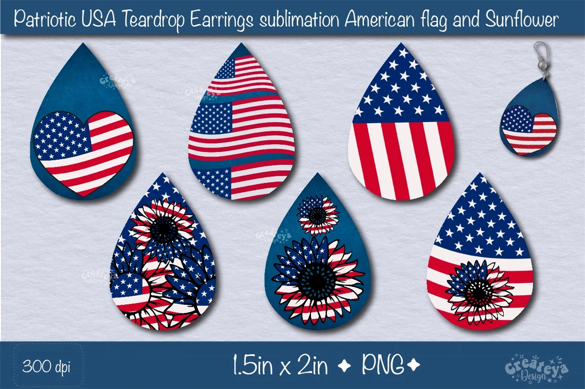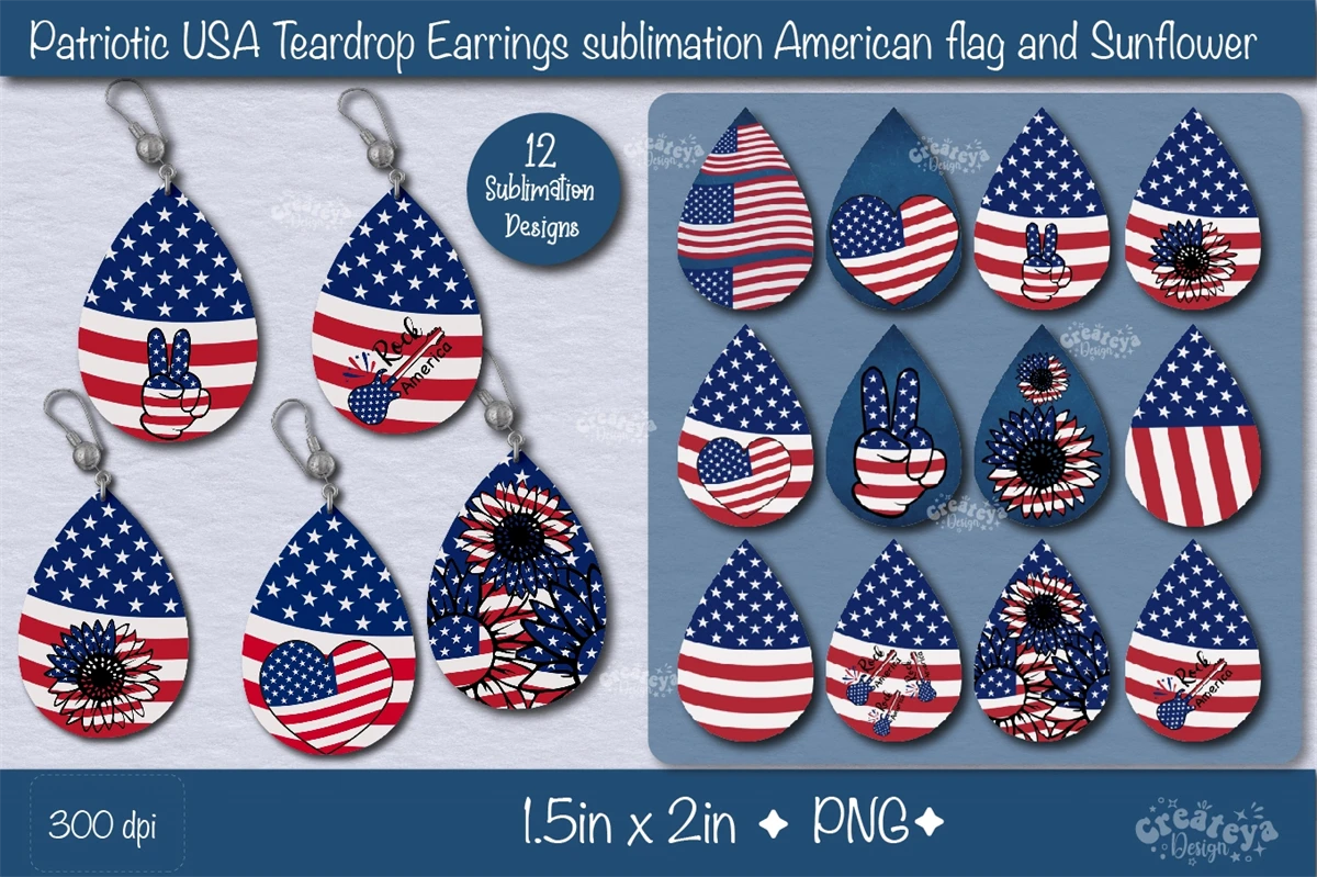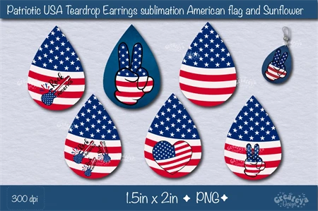 Create amazing sublimation crafts with a beautiful Patriotic USA Flag and Sunflower. Teardrop earring sublimation bundle PNG. This Bundle contains 12 teardrop earring designs.