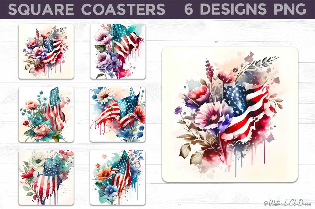 4Th Of July Square Coasters Patriotic Floral Coasters