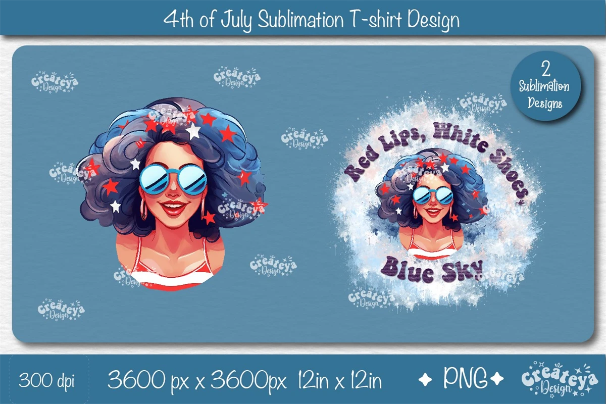 4th of July sublimation design png. USA Patriotic sublimation designs for t-shirts, tumblers, and mugs with Patriotic girl and quote Red Lips, White Shoes, Blue Sky.