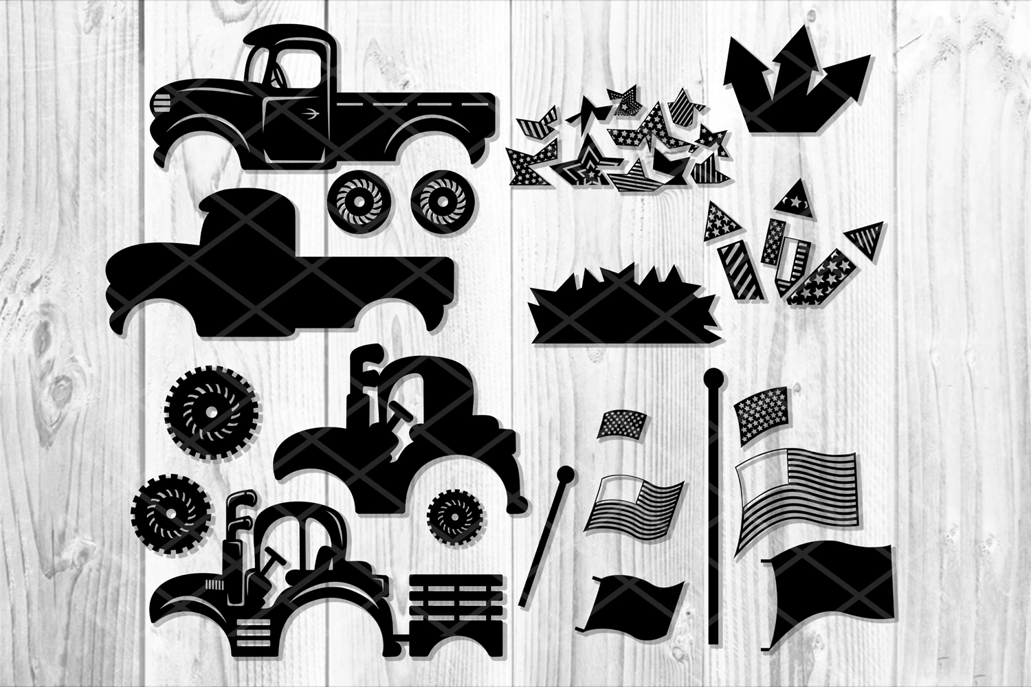 Layered Design Vintage 4th of July Truck and Tractor with Fireworks & Stars Independence Day Patriotic SVG Silhouette Clipart Cut Files Design Elements. Suit to make your own design for DIY projects for decorating your artwork.