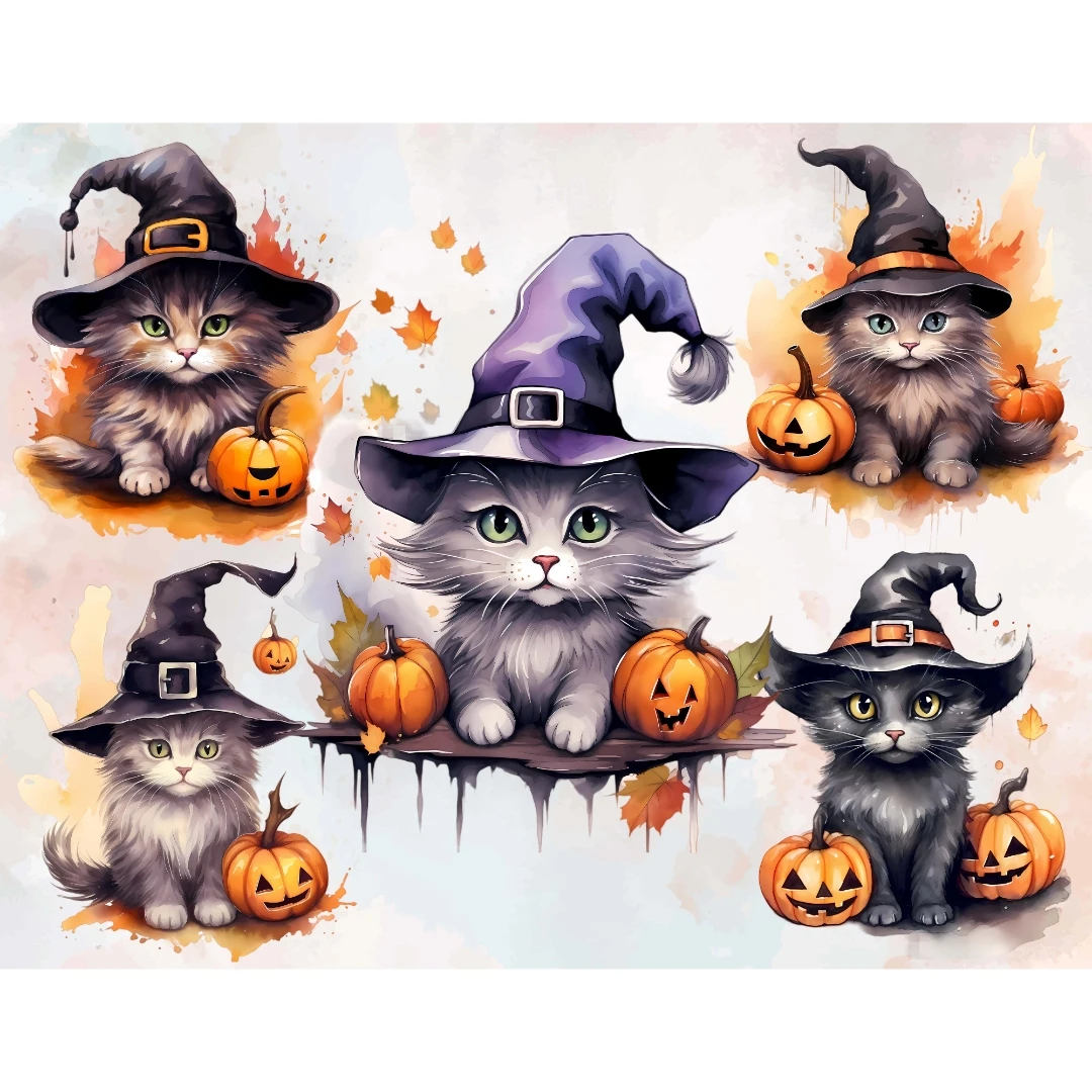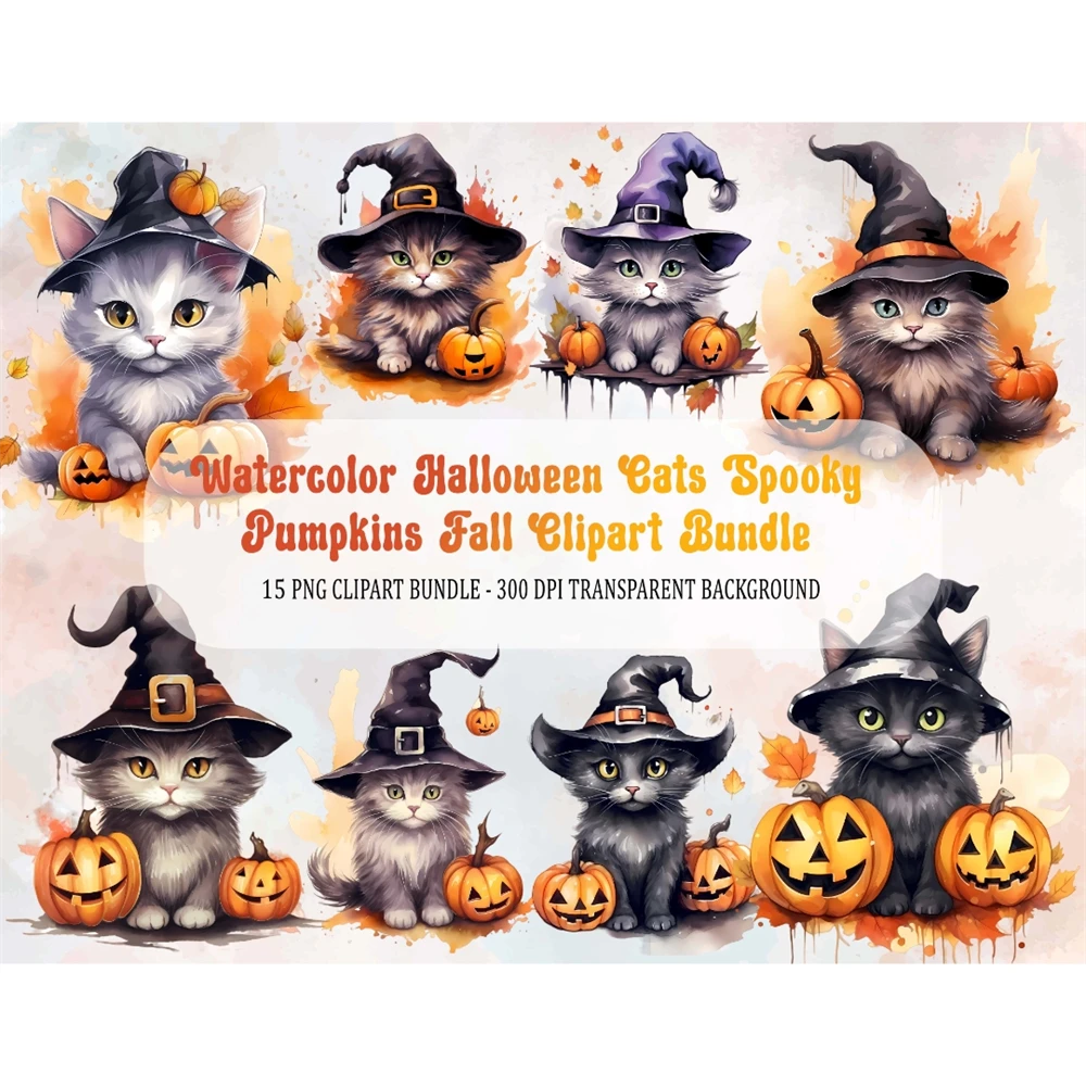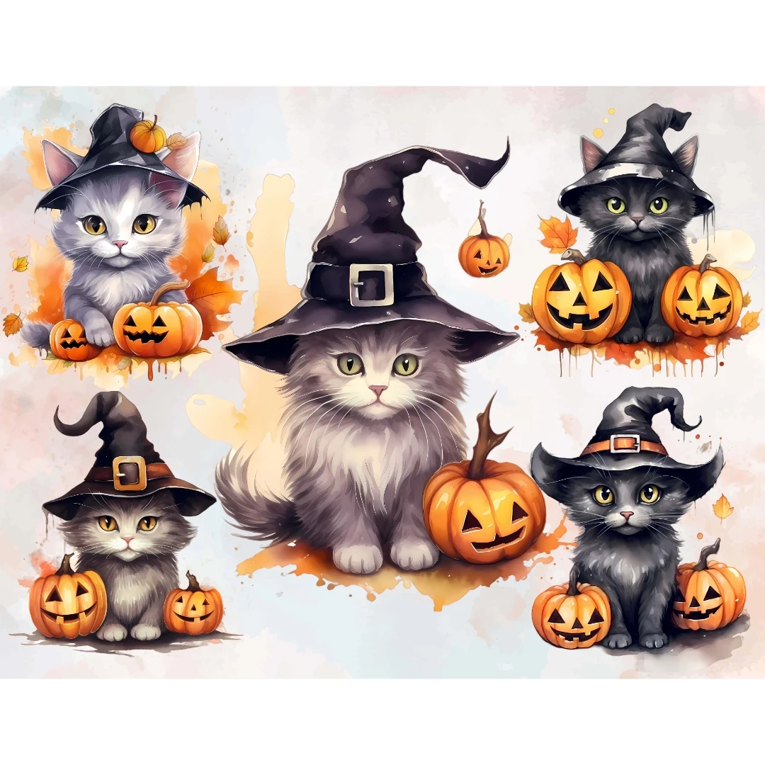 5 Watercolor Halloween Cats Spooky Pumpkins