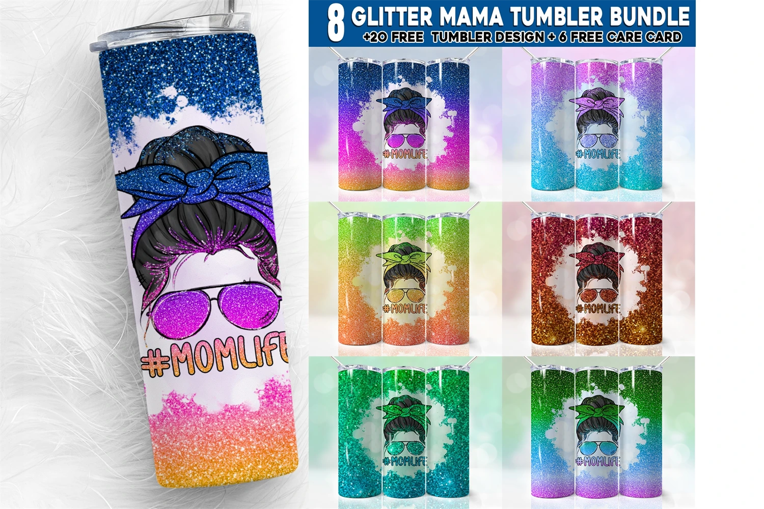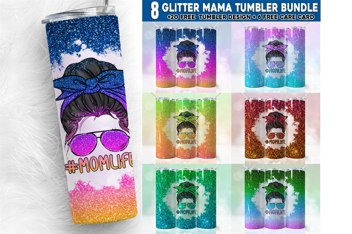 8 Glitter Mom Lfe Bundle, 20oz Mama Skinny Tumbler Wrap Png