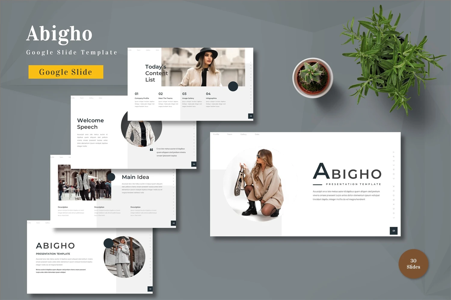 Get it now! **Abigho - Google Slide Template** for All Business and Personal Needs All elements on this template are editable; input your content, replace your image with a placeholder, change the color, and all presentations include an animated slide to present your slides.