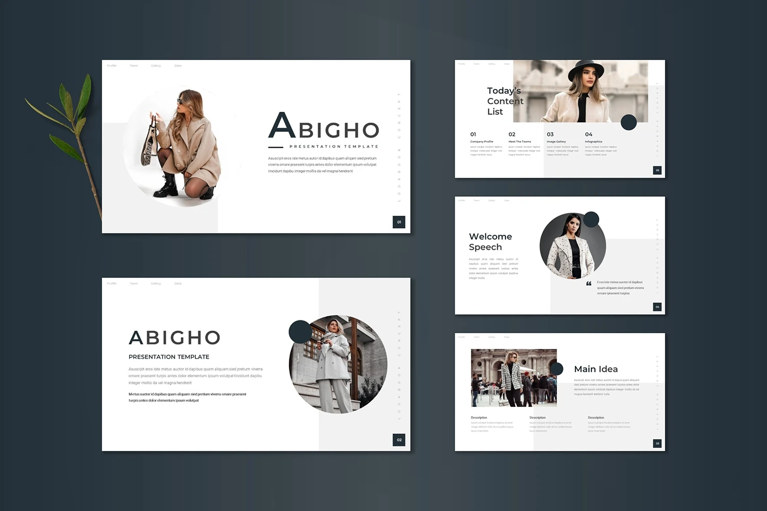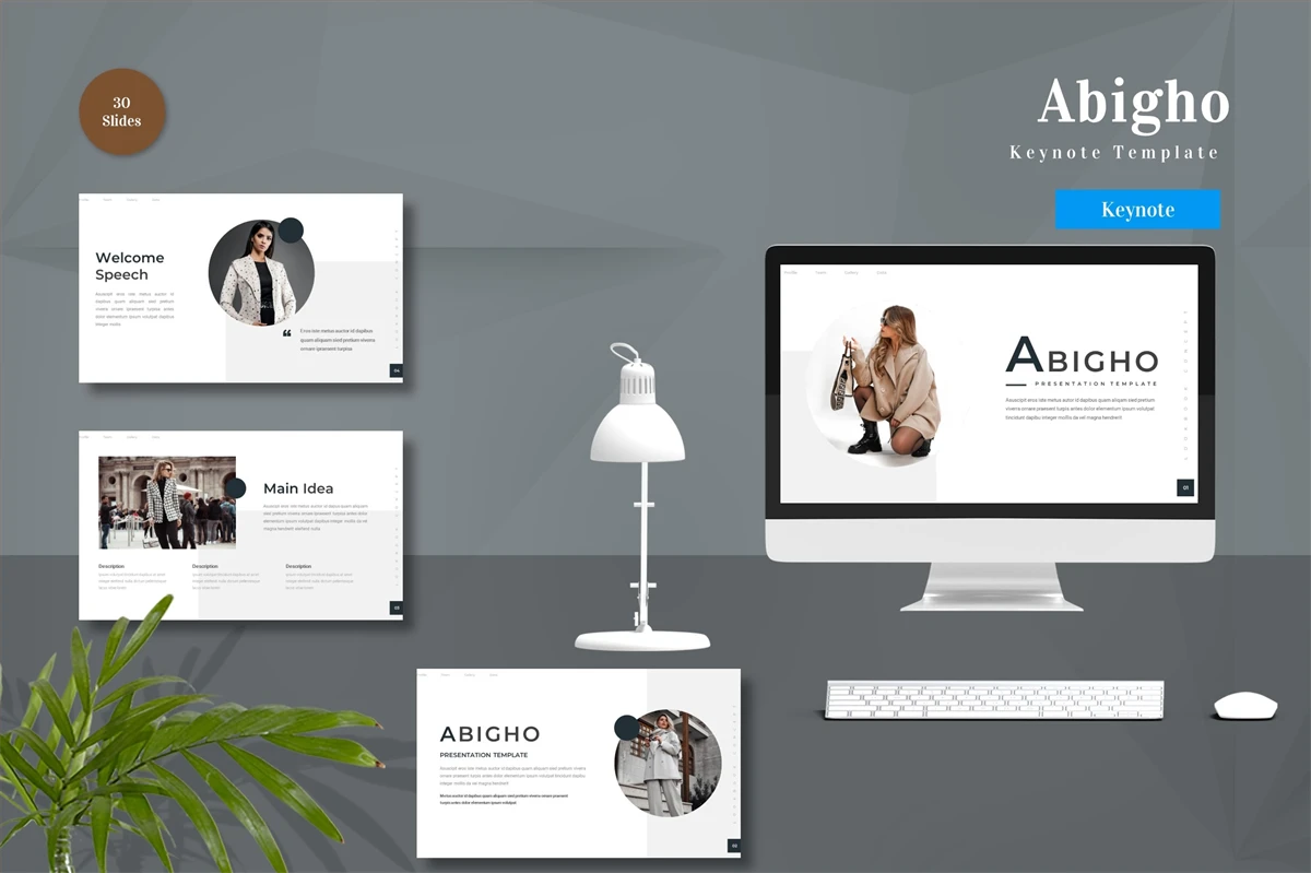 Get it now! **Abigho - Keynote Template** for All Business and Personal Needs All elements on this template are editable; input your content, replace your image with a placeholder, change the color, and all presentations include an animated slide to present your slides.