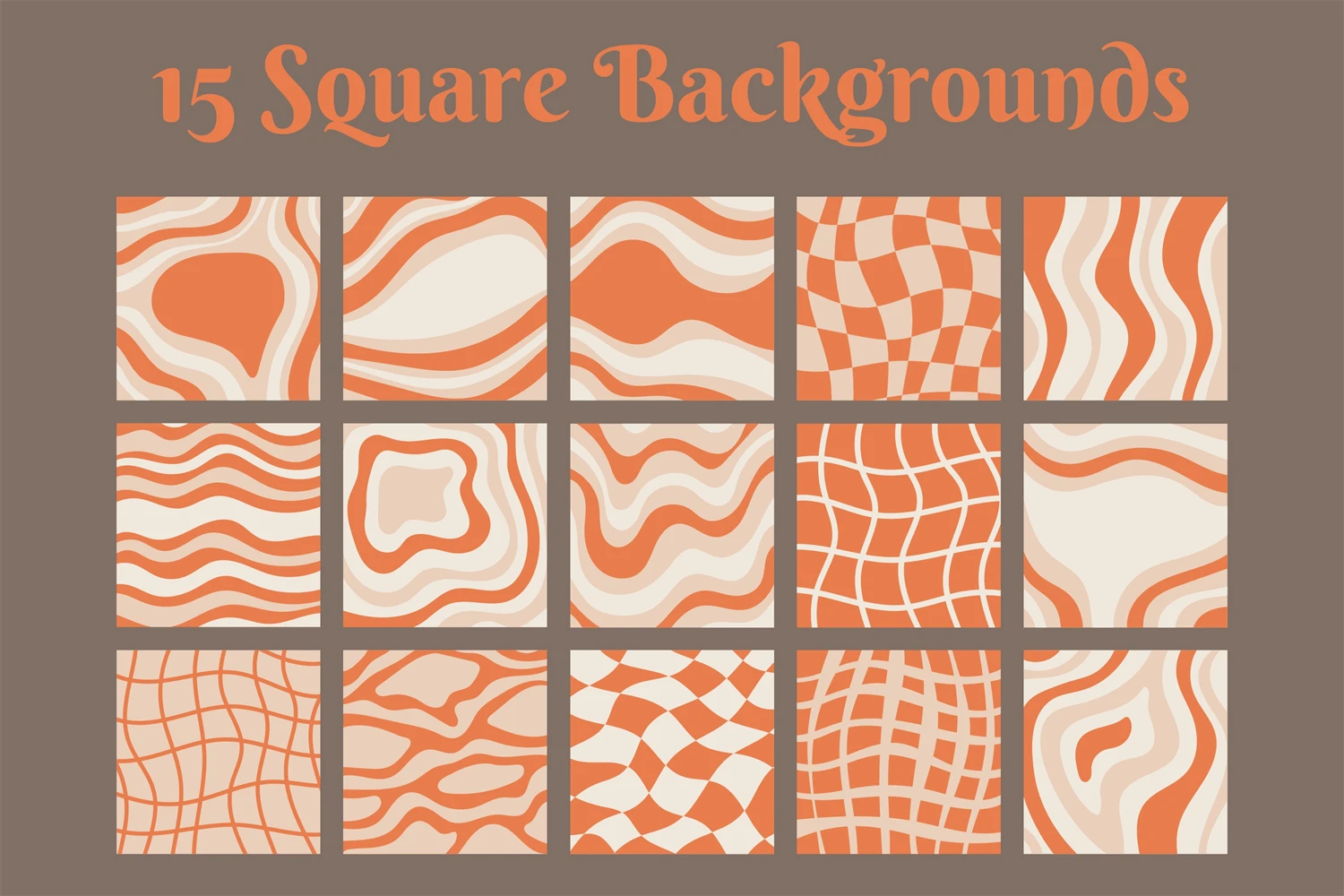 Trendy retro styled square backgrounds collection with wavy elements, stains, marble, distorted grid, checkerboard, chessboard. 60s, 70s vintage aesthetics templates for social media, posts, posters, banners, cards.