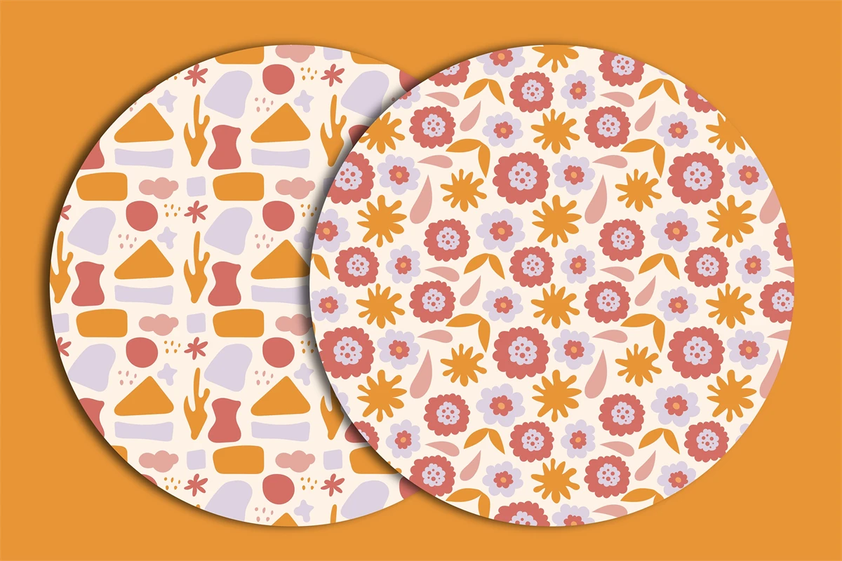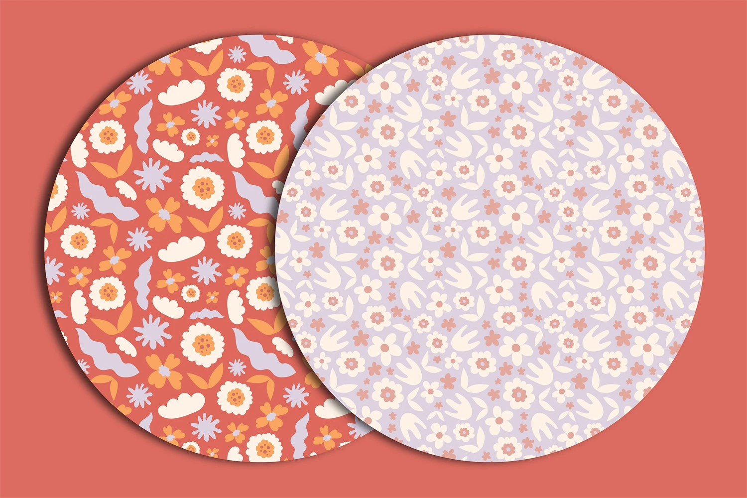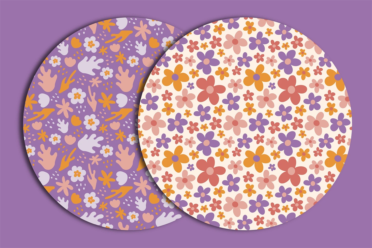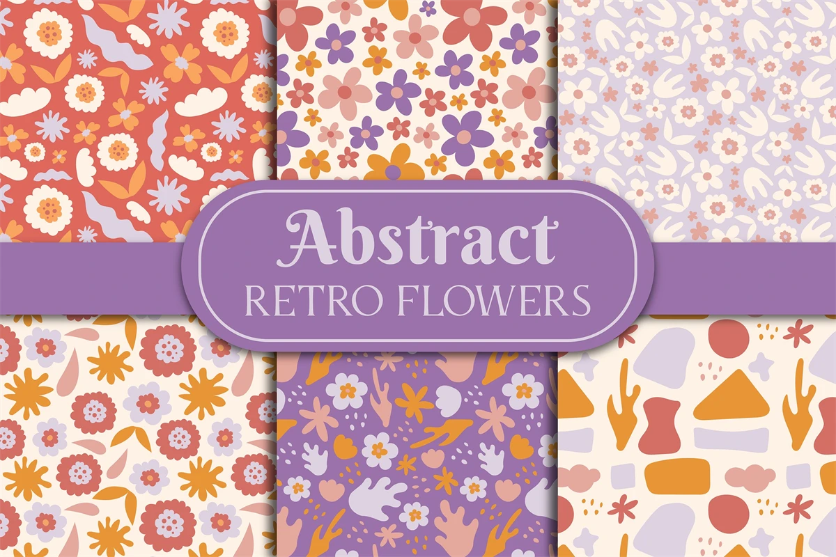 Abstract Retro Flowers collection includes 6 cute and beautiful groovy floral digital papers and seamless patterns with hand drawn blossoms, leaves, geometric organic shapes and other nature elements. Pretty seamless backgrounds with gentle fresh colors and trendy retro style design with various chamomile, daisy and other blooming flowers are perfect for textile, fabric, greeting card, wrapping paper, packaging, scrapbooking, apparel, accessory, wallpaper, etc.