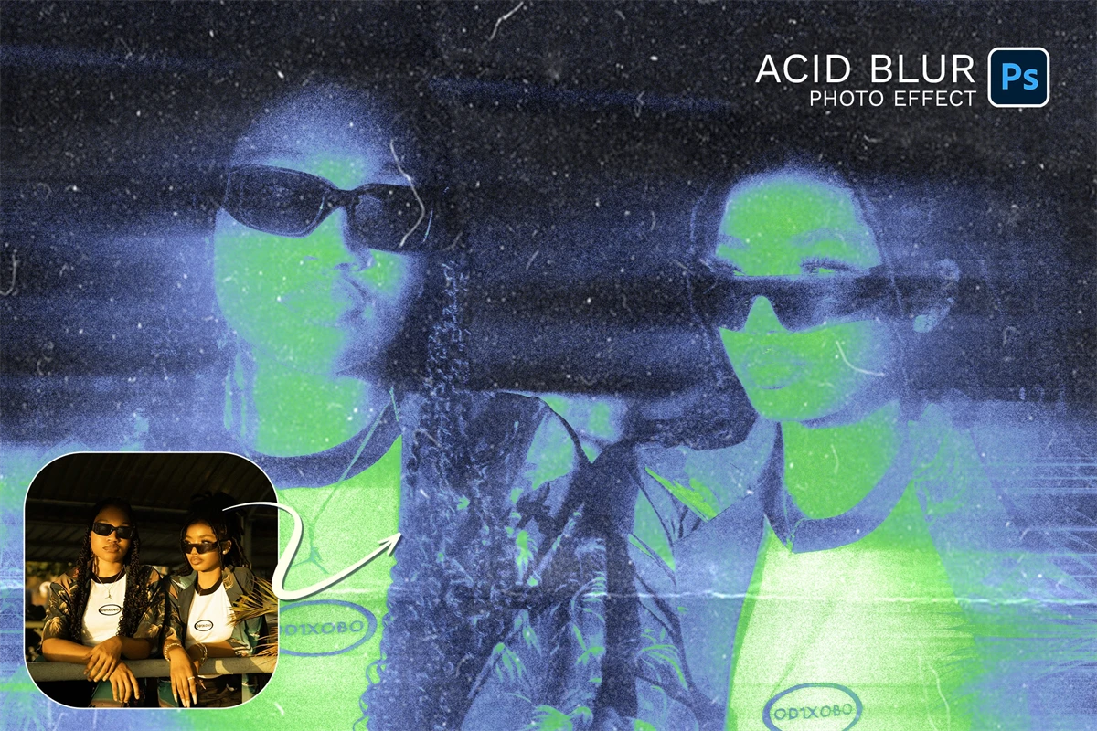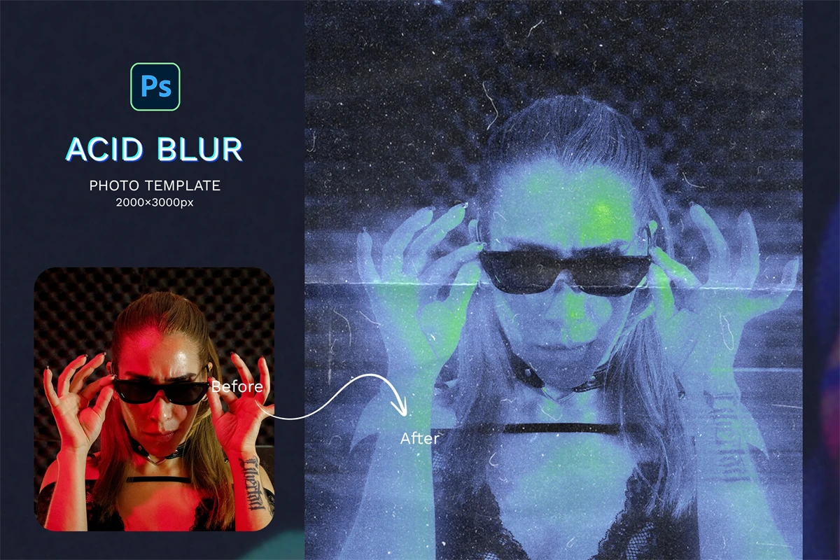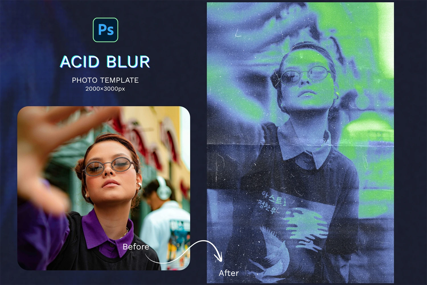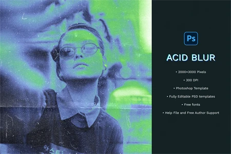Transform your photos with the intense and edgy 'Acid Blur Photo Effect' Photoshop template. This template utilizes striking acid colors and grunge overlay textures to create a bold, distorted look that's perfect for modern and experimental designs. Ideal for portrait mode, this effect excels in crafting eye-catching posters that demand attention.