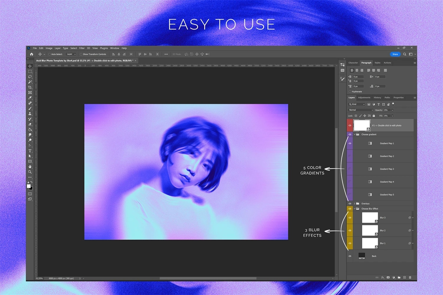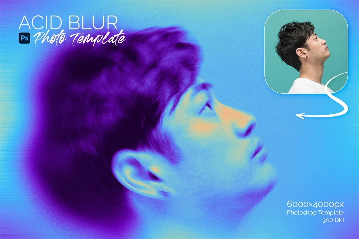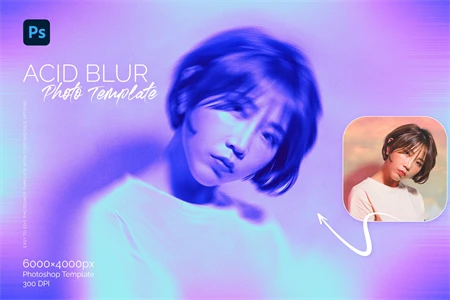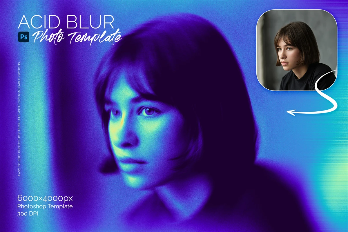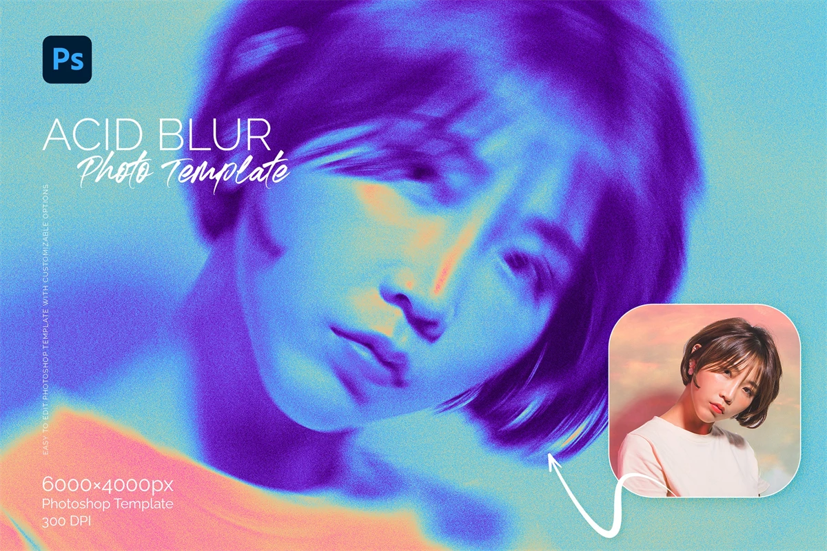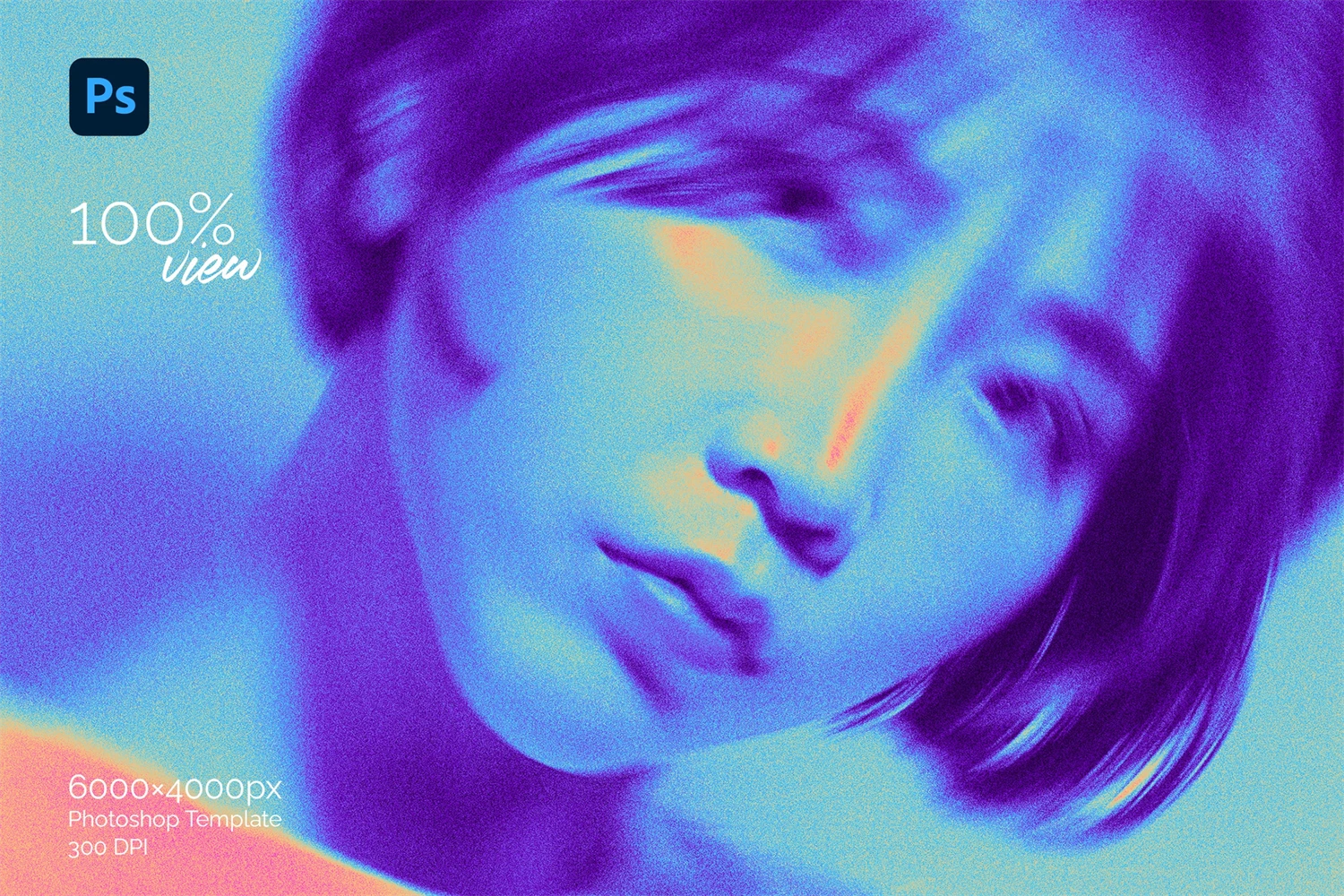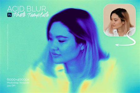 Easy to use template via smart object replacement. Creative vivid effect with acid colors and grain overlay. Get cool and stylish photos from your regular photos! Impress all the world with your creativity)