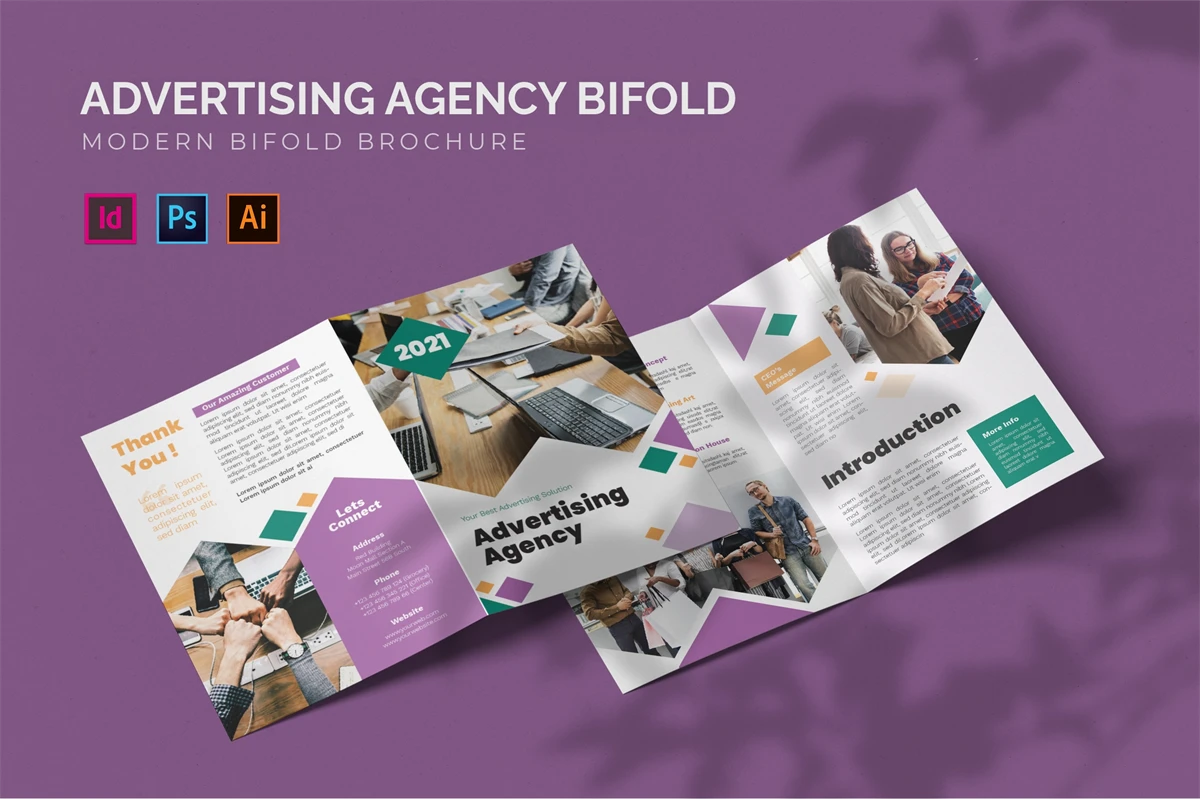 Advertising Agency - Bifold Brochure We present this Bifold Brochure for you, simple and very elegant, and this Bifold Brochure is suitable for all types of your business, made with Adobe InDesign (INDD), Adobe Photoshop (PSD) and Adobe Illustrator (AI), very easy to customize, Hope you Like it, dont forget to rate, Thanks.