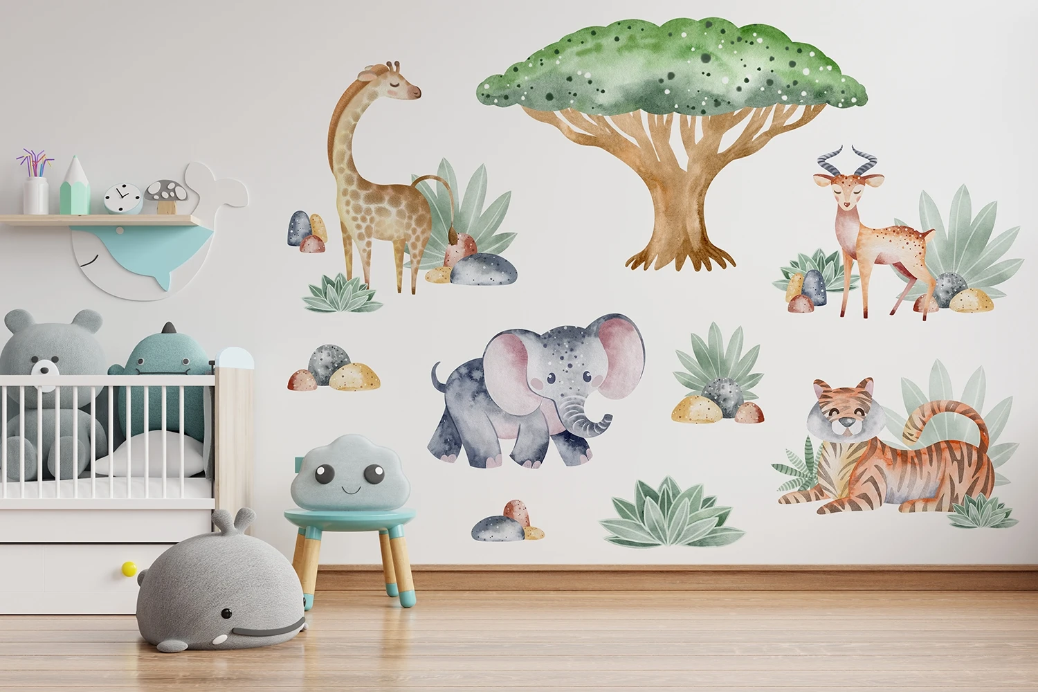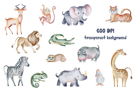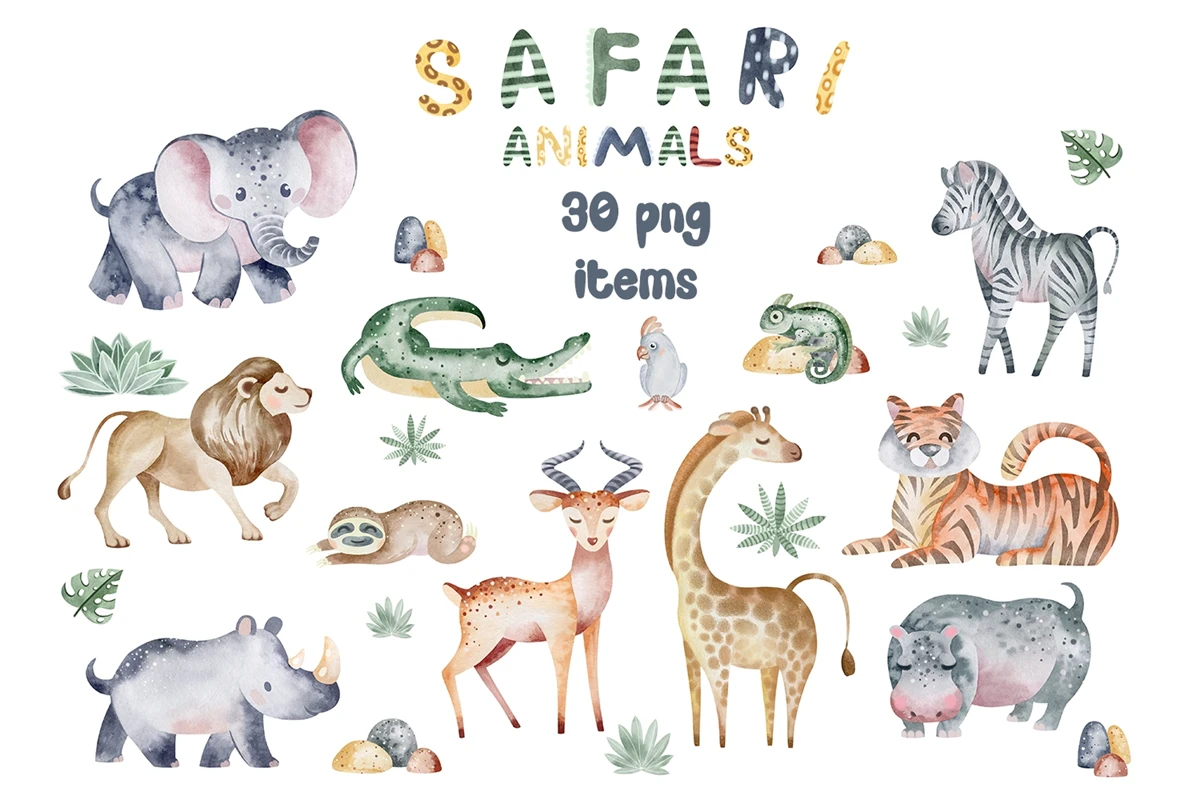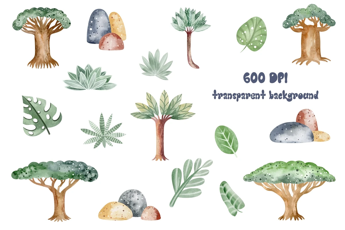 Set of high quality hand drawn watercolor images of safari with animals and elements of trees, stones, plants.