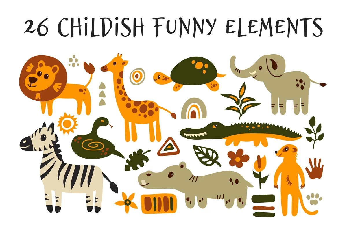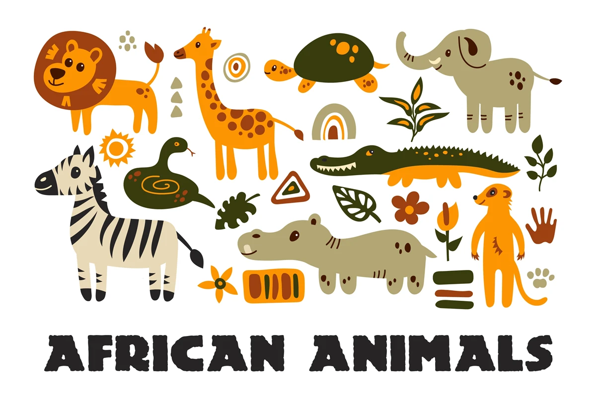Funny childish clipart with hand-drawn African Animals and abstract organic shapes in trendy minimal cartoon style. Tropical and Jungle exotic animals collection with doodles. Perfect for kids, t-shirt print, poster, greeting card, social media, etc. Vector illustration.
