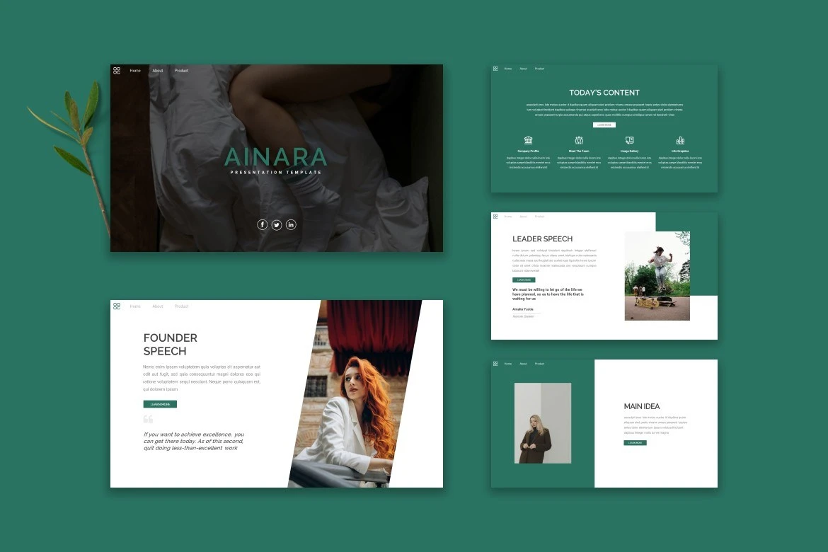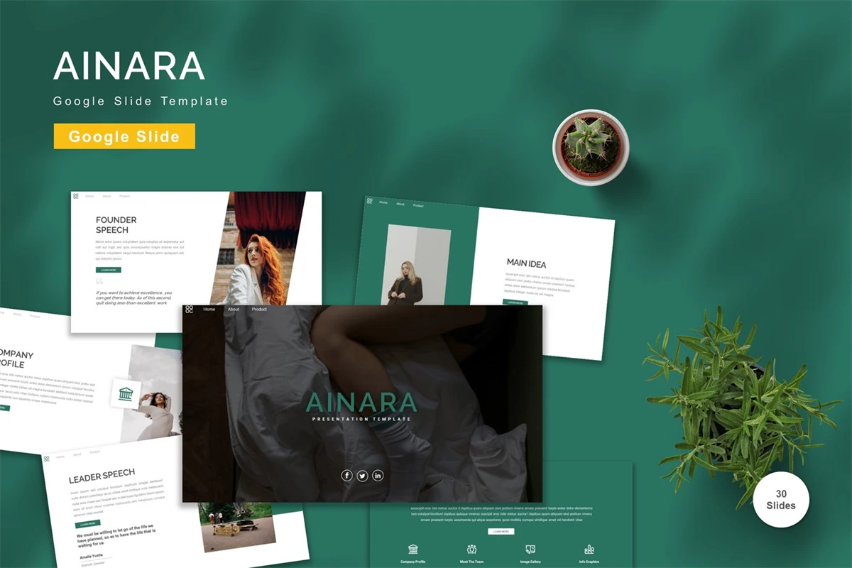 Get it now! **Ainara - Google Slide Template** for All Business and Personal Needs All elements on this template are editable; input your content, replace your image with a placeholder, change the color, and all presentations include an animated slide to present your slides.