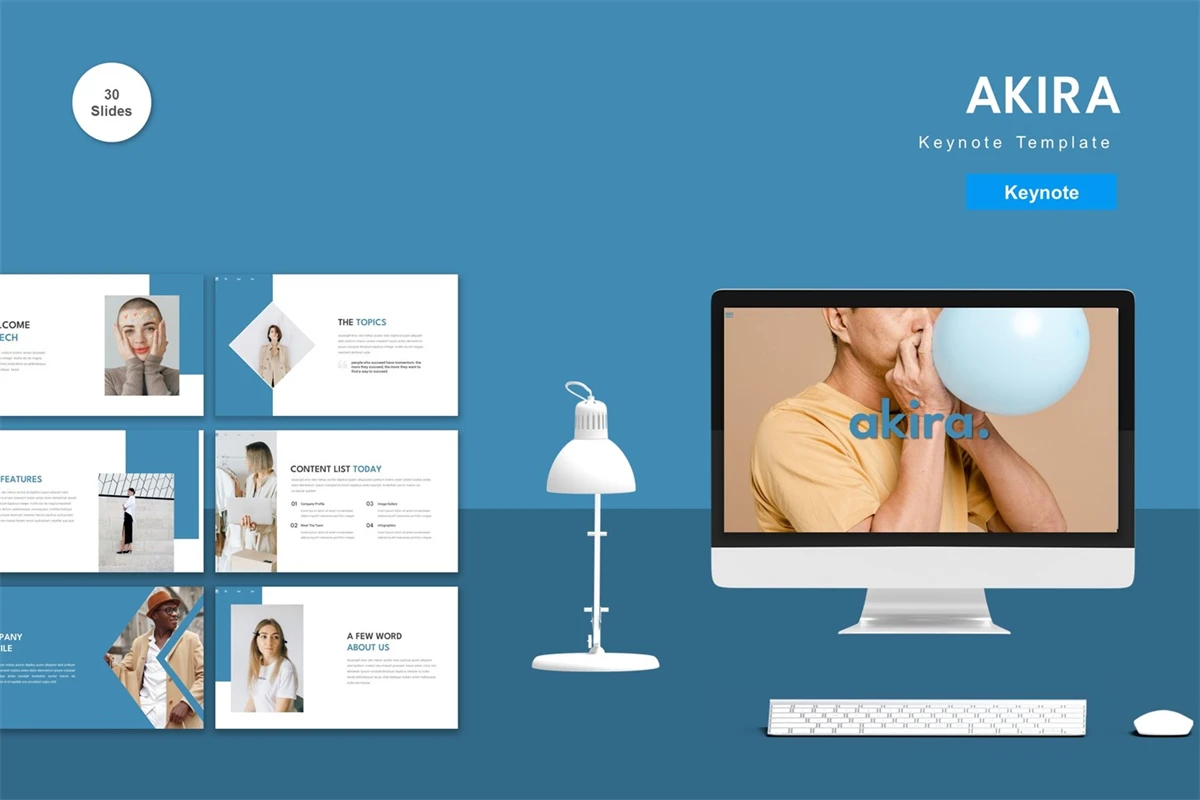 Get it now! **Akira - Keynote Template** for All Business and Personal Needs All elements on this template are editable; input your content, replace your image with a placeholder, change the color, and all presentations include an animated slide to present your slides.