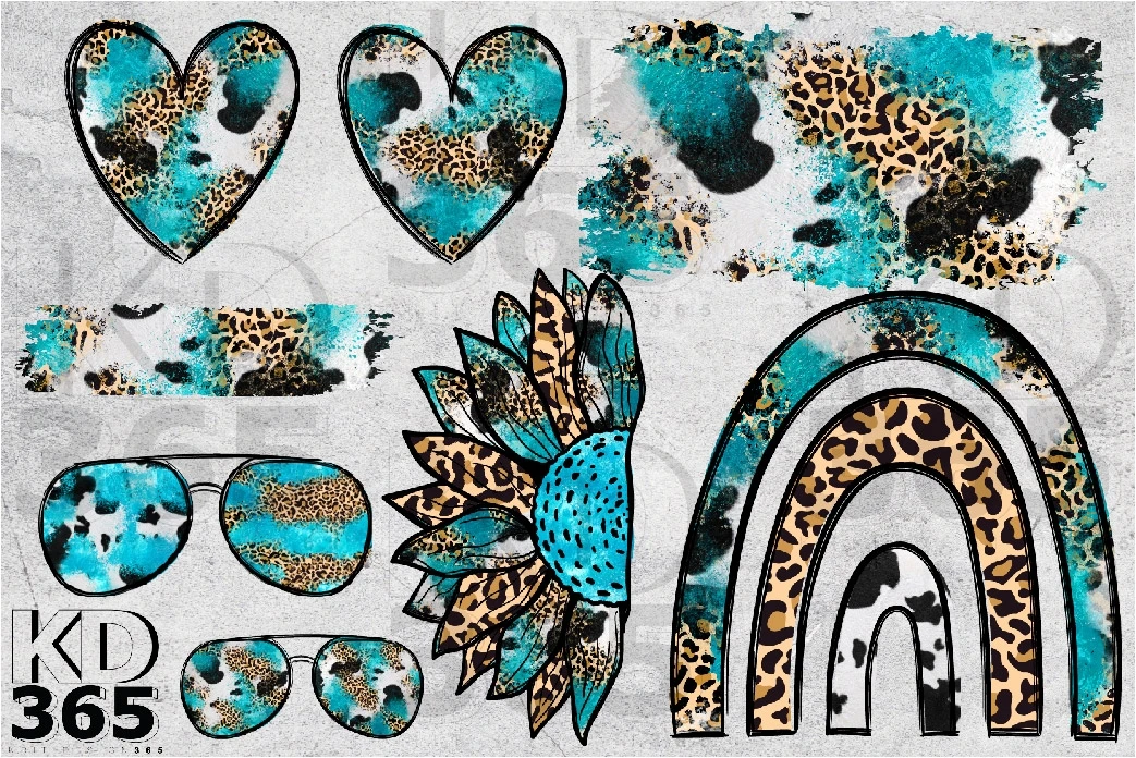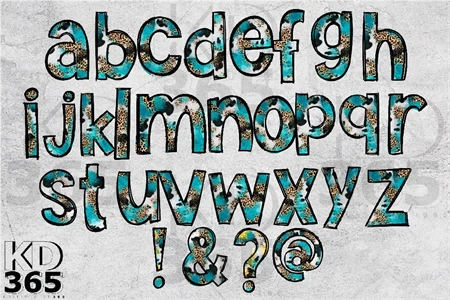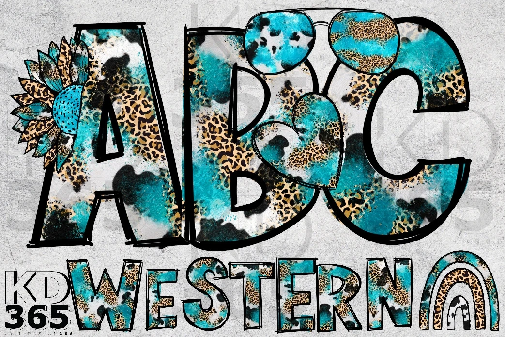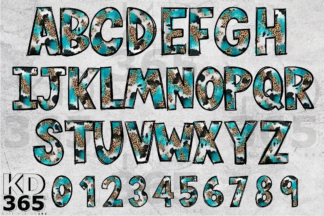 This Western Alphabet PNG Sublimation Design features a captivating combination of Leopard Cow Skin and Turquoise Texture.