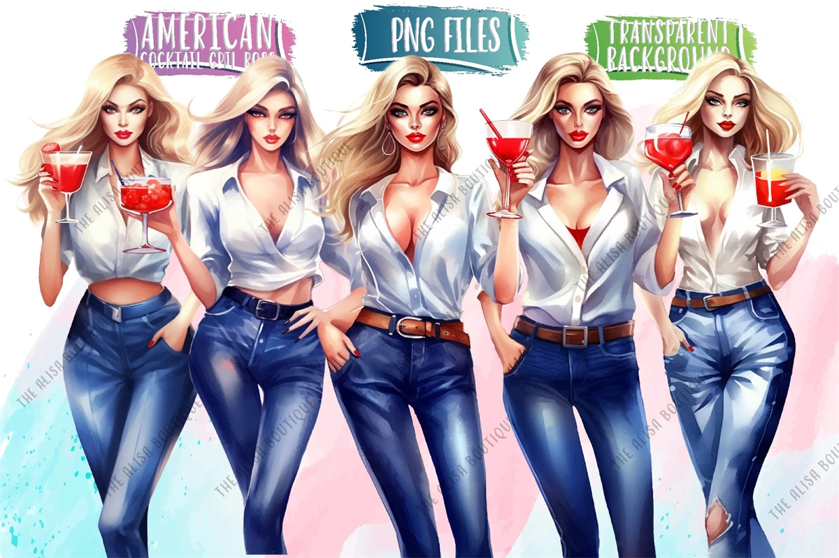 Elevate your designs with our American Cocktail Girl Boss Clip Art collection! Perfect for creating vibrant and stylish designs for cocktail parties, girl boss projects, card decorations, and more. Embrace the American girl life with a touch of boutique fashion and a patriotic theme. Let your creativity shine and celebrate the 4th of July in style!