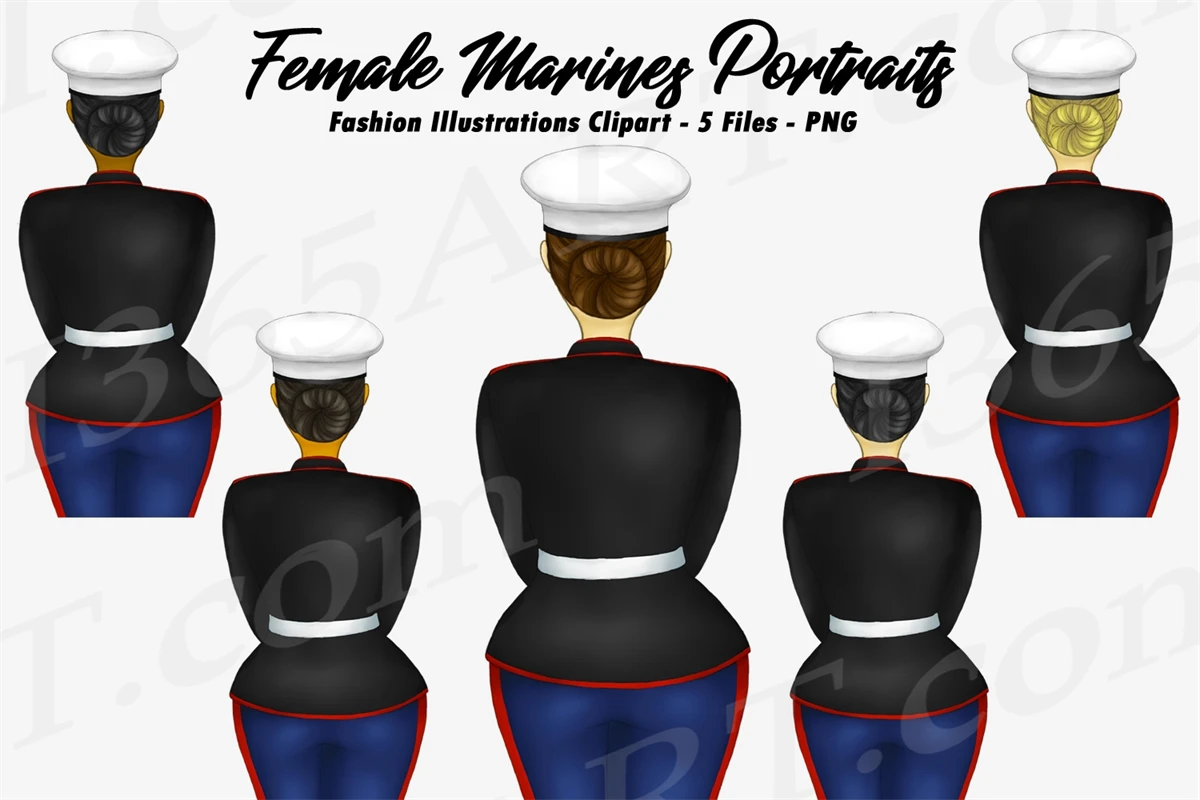 This set contains 5 hand drawn illustrations of marine women vets. Can be used in various projects including planner stickers, stationary, scrapbooking, party invitations, crafts, decorations and more!