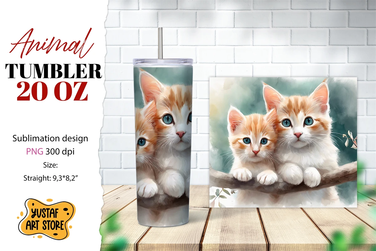 Animal tumbler 20 oz sublimation. Cute Mom and Baby cat AI illustration watercolor design