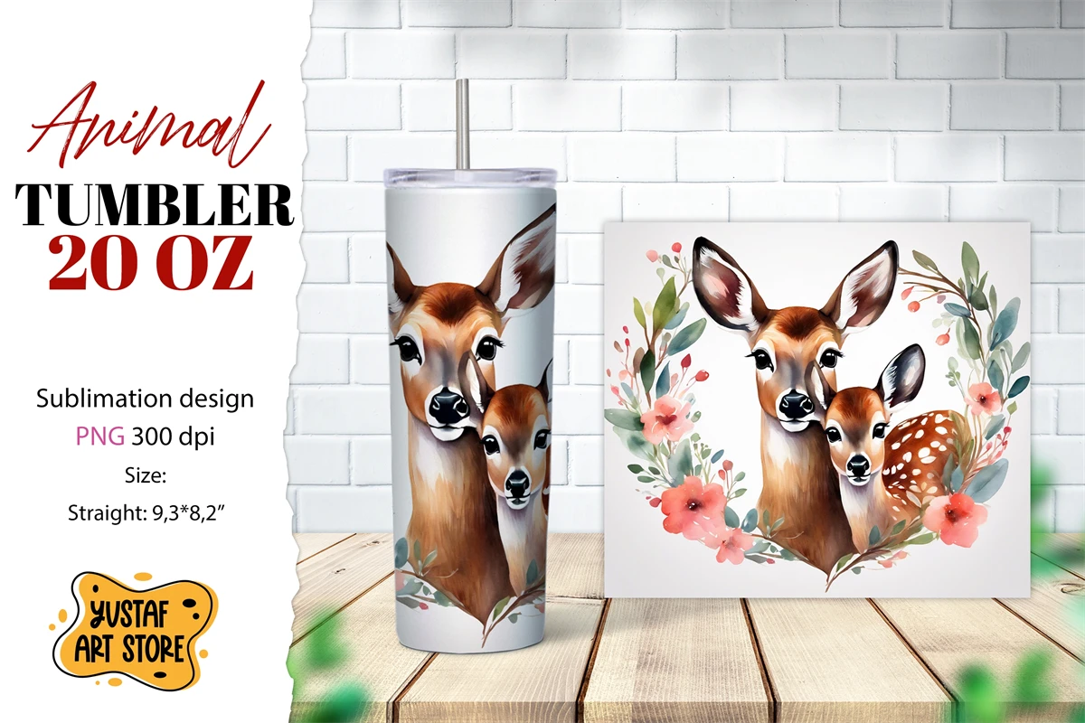 Animal tumbler 20 oz sublimation. Cute Mom and Baby deer AI illustration watercolor design