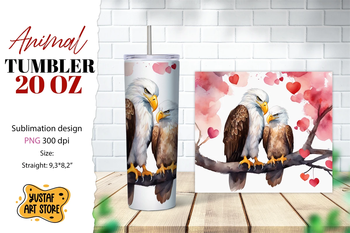 Animal tumbler 20 oz sublimation. Cute Mom and Baby eagle AI illustration watercolor design
