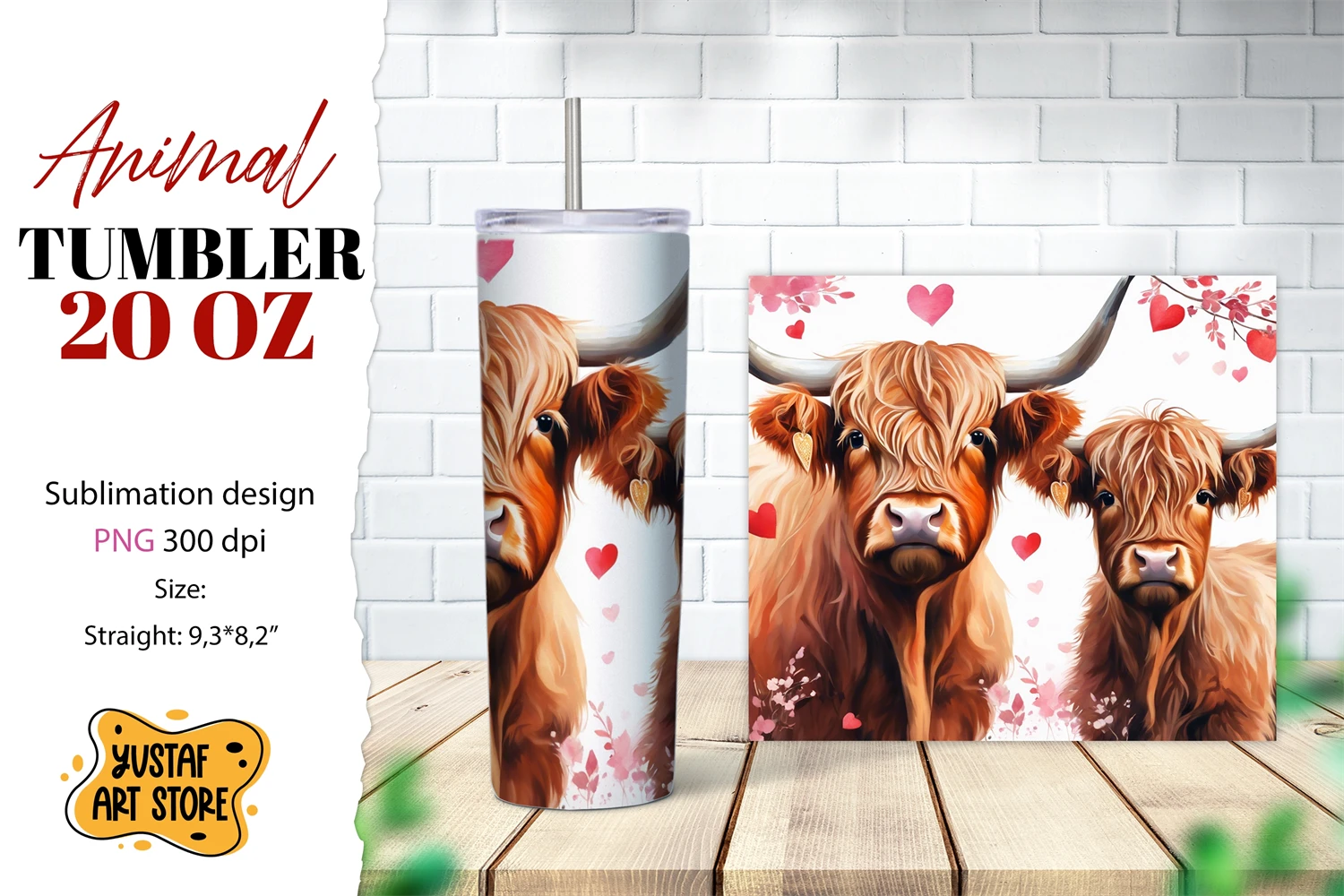 Animal tumbler 20 oz sublimation. Cute Mom and Baby highland cow AI illustration watercolor design