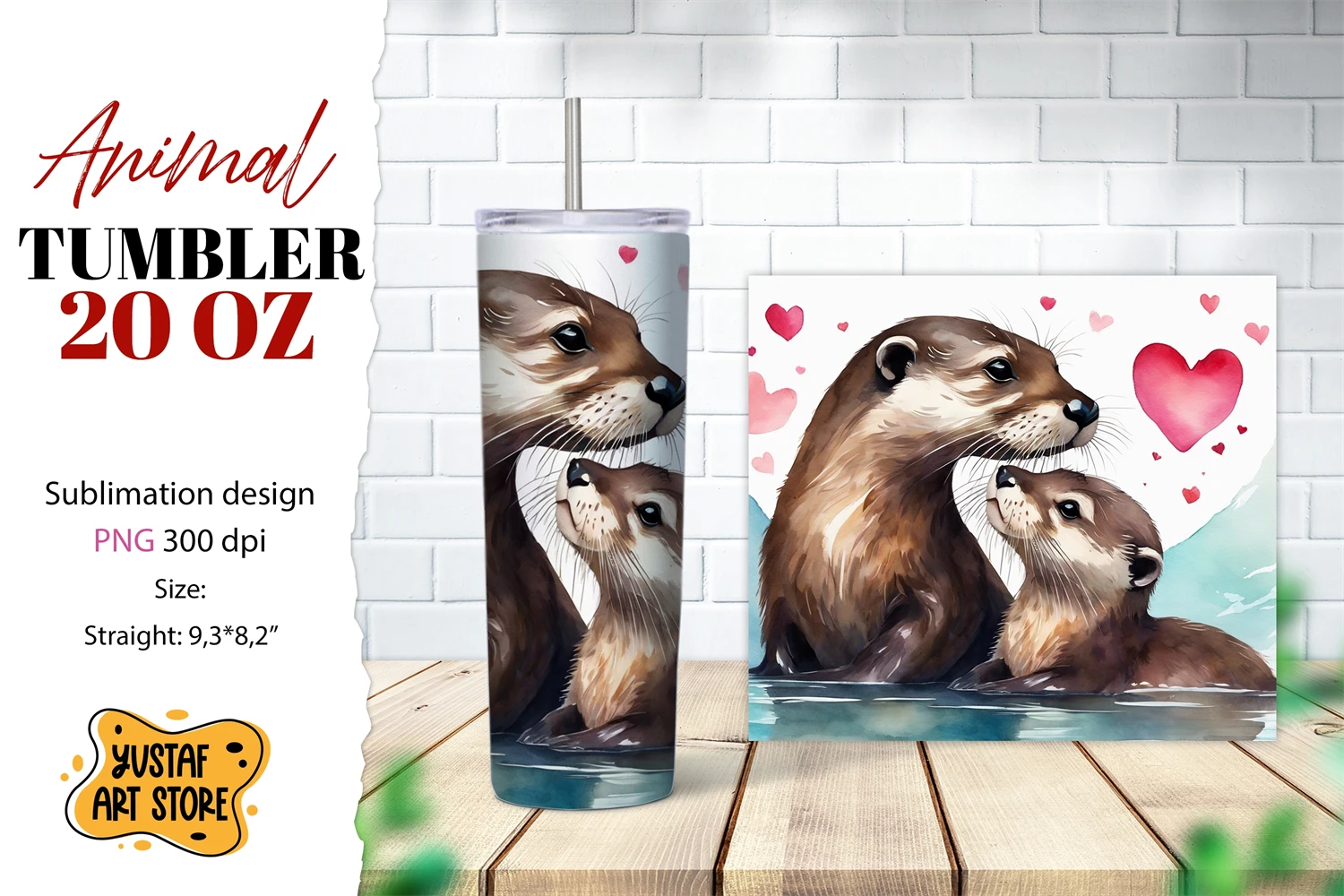 Animal tumbler 20 oz sublimation. Cute Mom and Baby otter AI illustration watercolor design