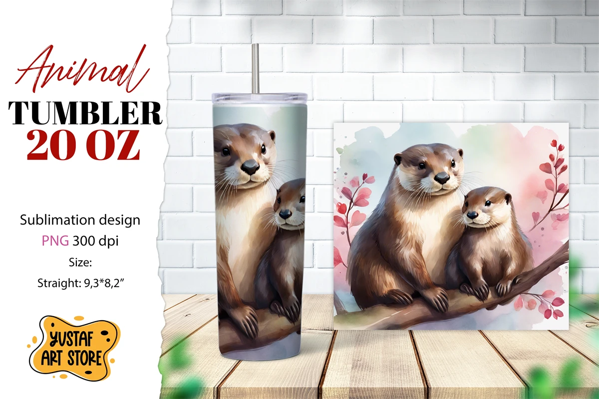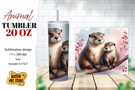 Animal tumbler 20 oz sublimation. Cute Mom and Baby otter AI illustration watercolor design