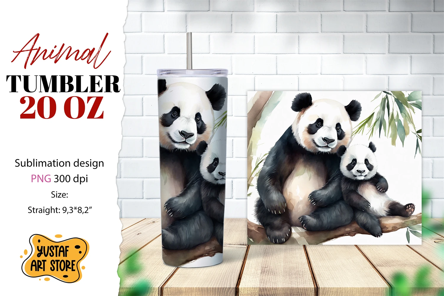 Animal tumbler 20 oz sublimation. Cute Mom and Baby Panda AI illustration watercolor design