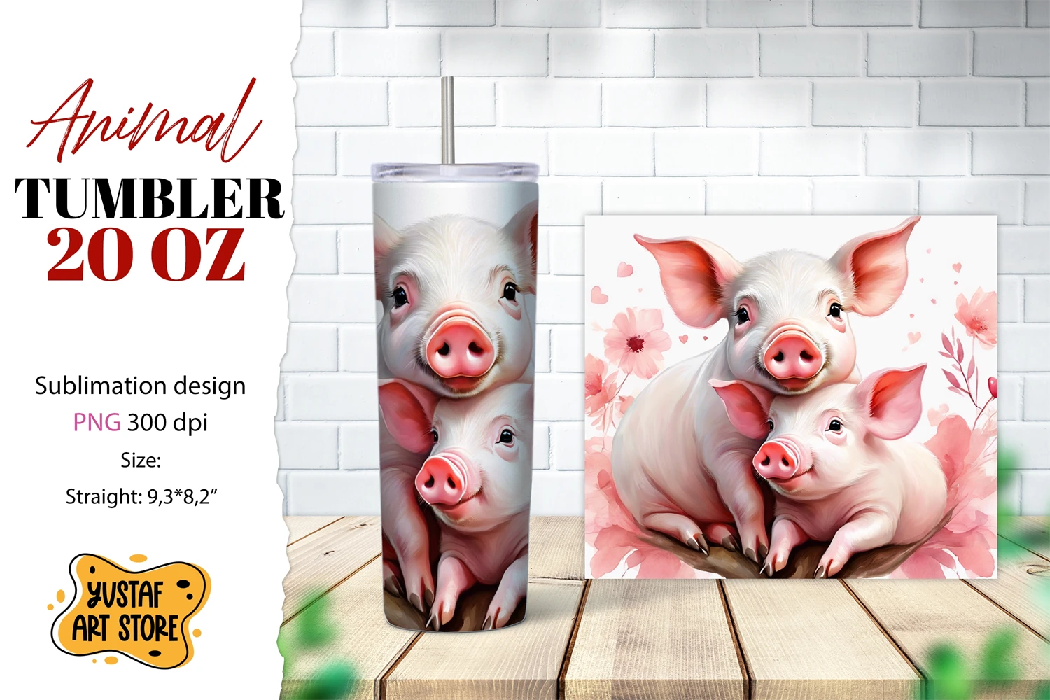 Animal tumbler 20 oz sublimation. Cute Mom and Baby Pig AI illustration watercolor design
