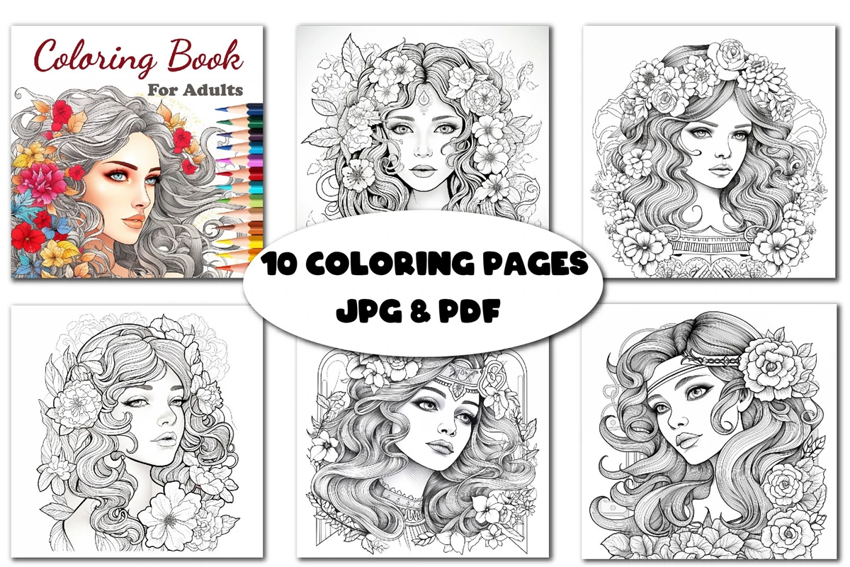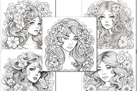 Anti-stress coloring book with girls with flowers for adults