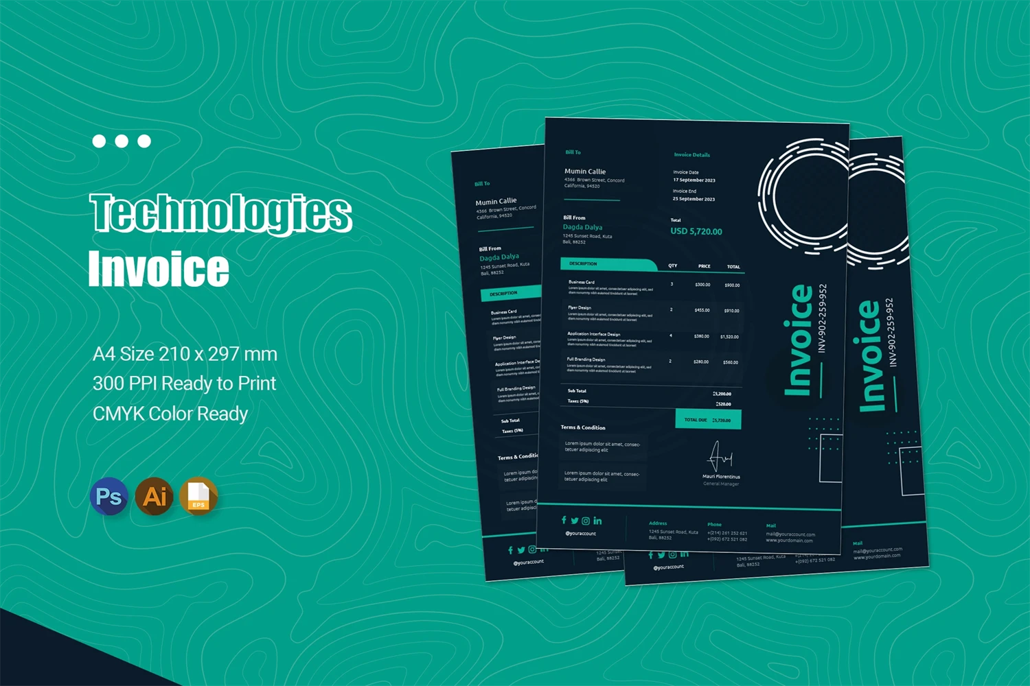 Use our invoices to make your bookkeeping easier and to impress your clients with an invoice display that has a modern, elegant design and strong typography. This invoice template is easy to use and customizable, making it perfect for any medium.