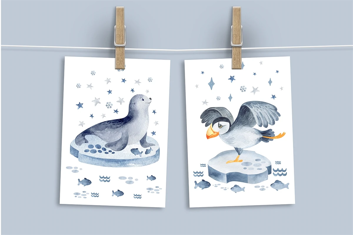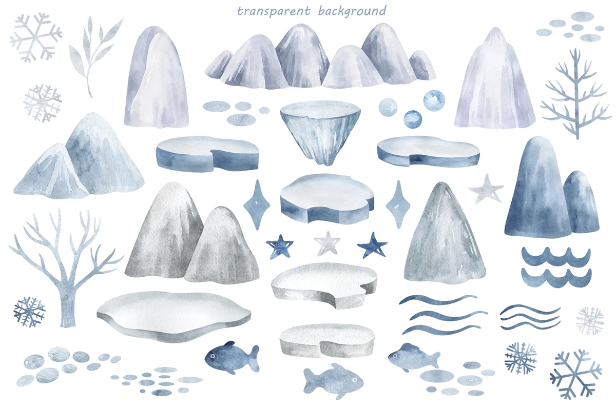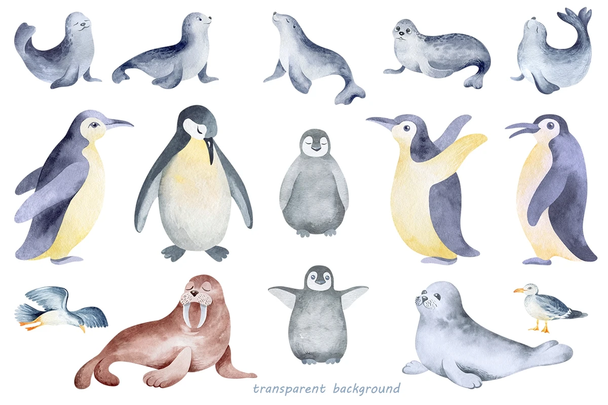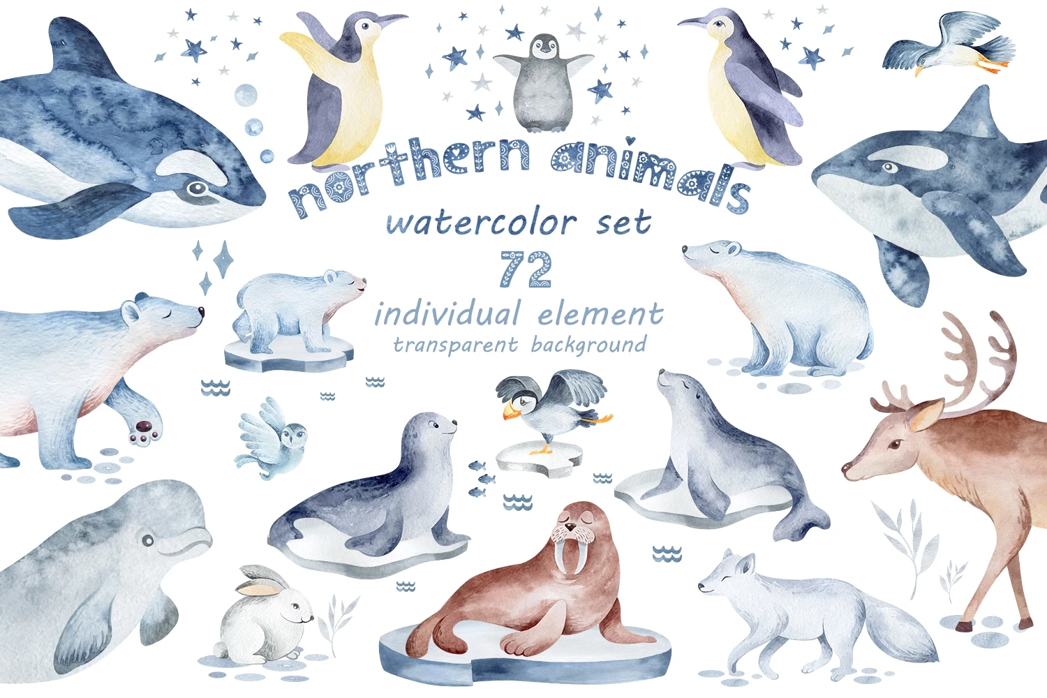 This is a set of 72 individual elements of the animals of the north. PNG format. Made in watercolor technique. All elements on a transparent background. Perfect for sublimation, kids decor, clothes, tableware, things and more.