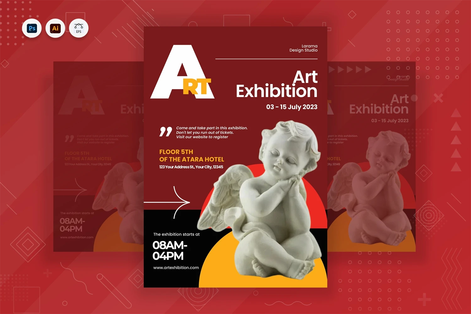 Here is our business Poster template! This is creative and corporate style Poster template, **Art Exhibition Poster**- Get it now!,great Poster template for All business and personal needs. All elements on this template are editable from Ai & EPS tools, input your content, replace your image with a placeholder, change the color, and, all templates include professional layouts and present your template to the world. This design will great for promoting Specification