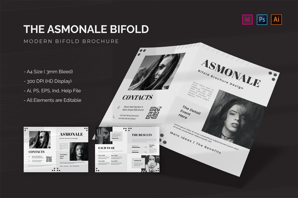 Asmonale - Bifold Brochure We present this Bifold Brochure for you, simple and very elegant, and this Bifold Brochure is suitable for all types of your business, made with Adobe InDesign (INDD), Adobe Photoshop (PSD) and Adobe Illustrator (AI), very easy to customize, Hope you Like it, dont forget to rate, Thanks.