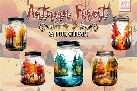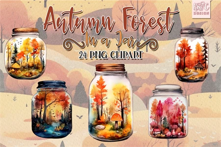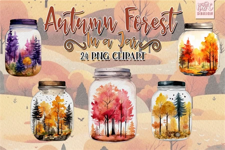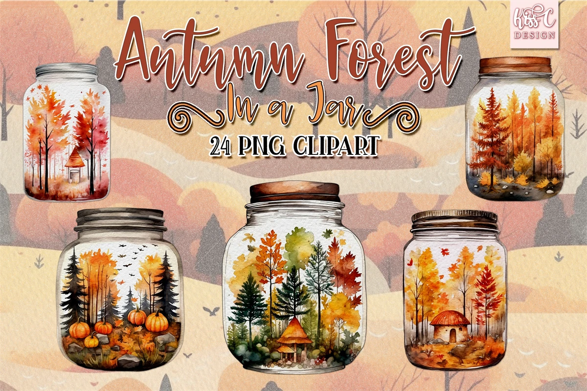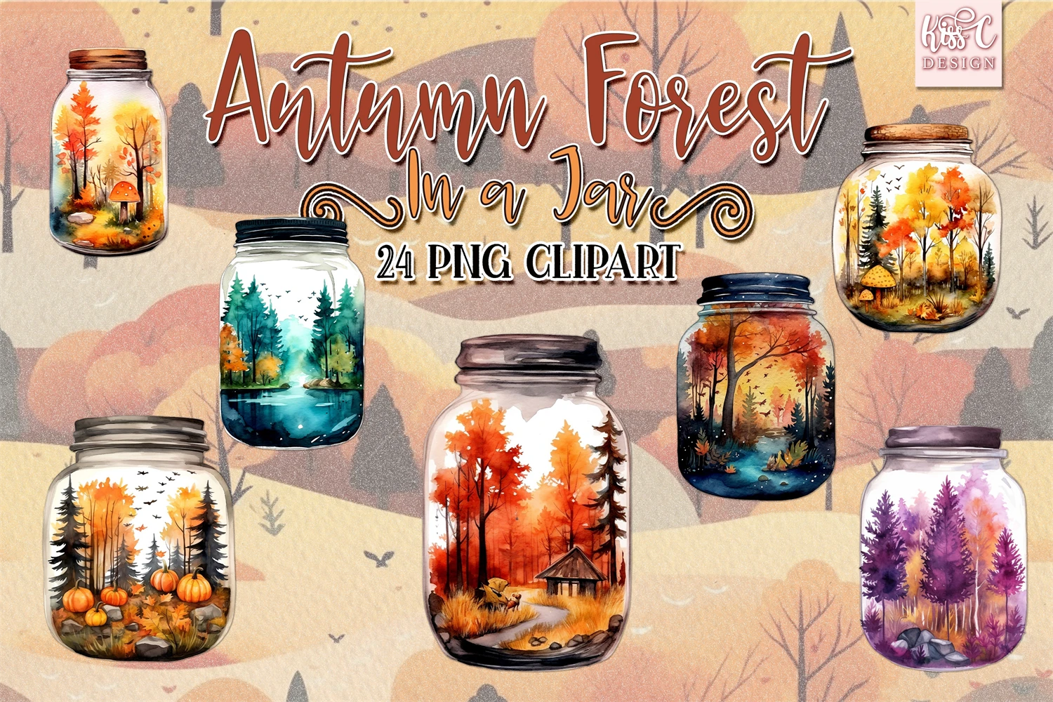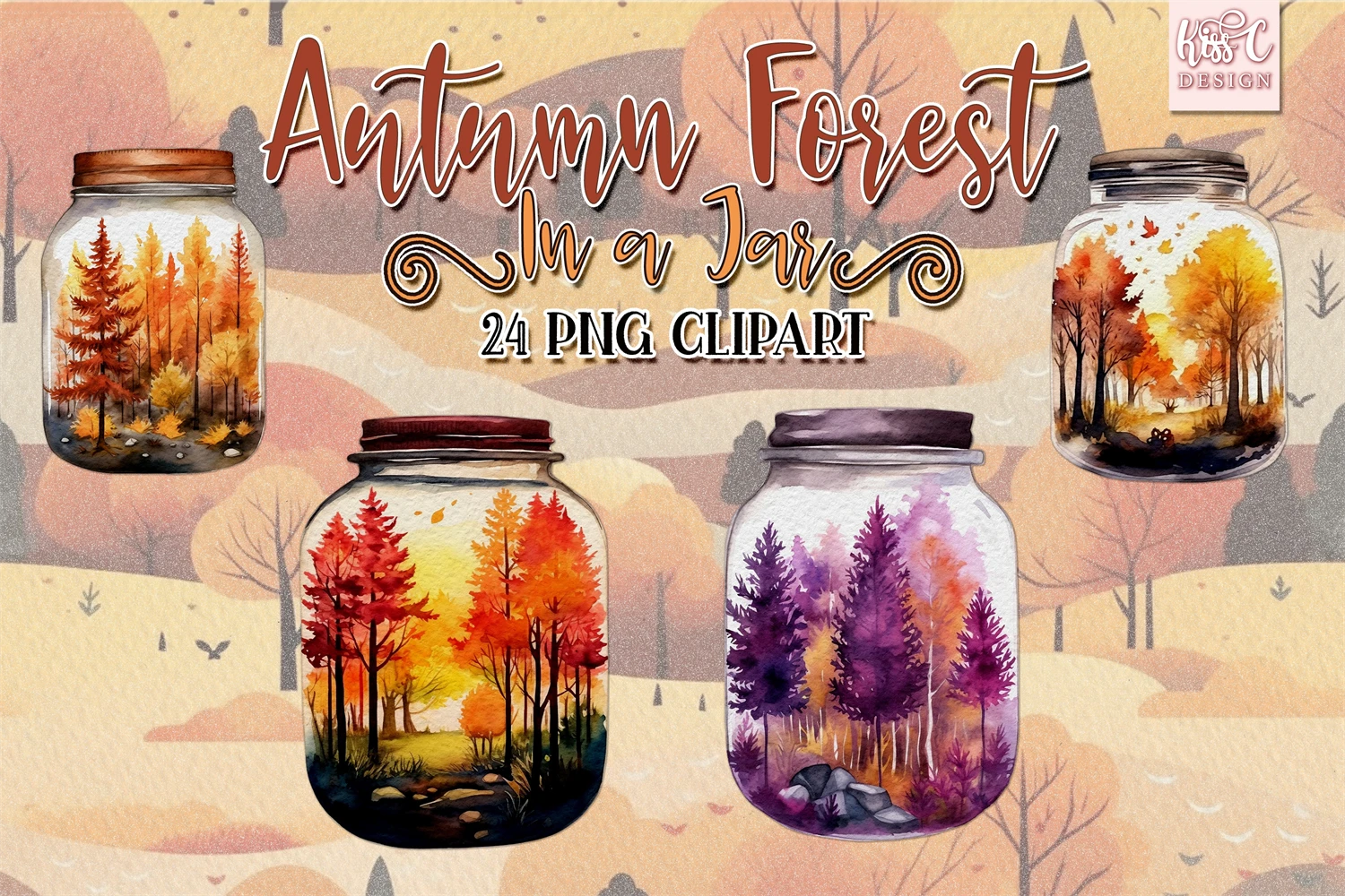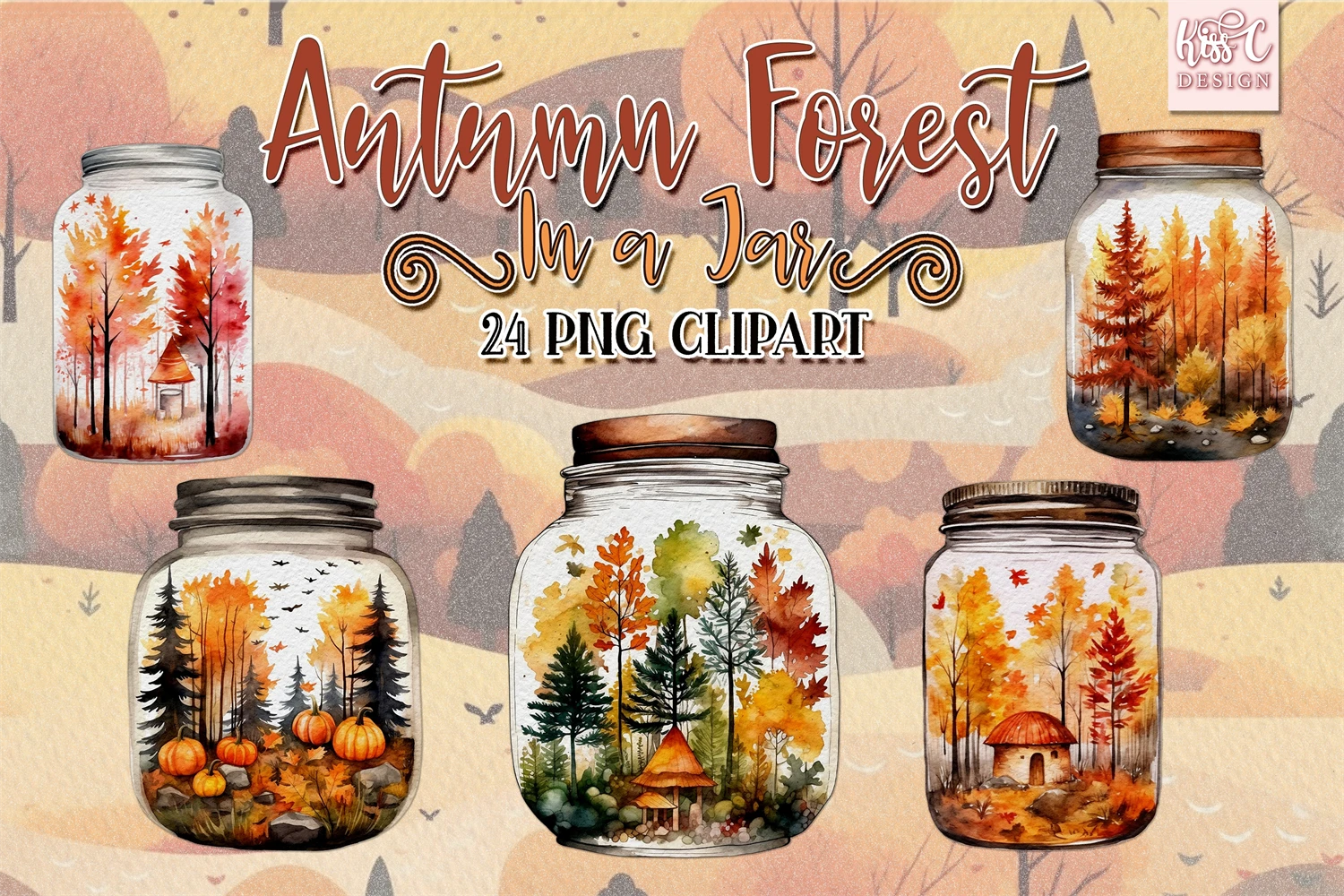 Watercolor Autumn Forest in a Jar Illustration Clipart - Autumn Forest Painting Clipart PNG graphics