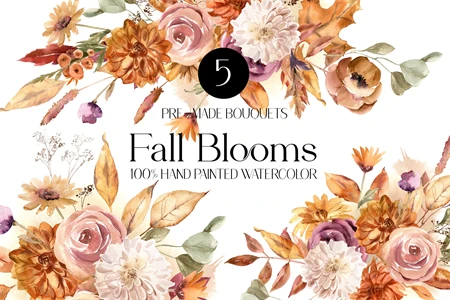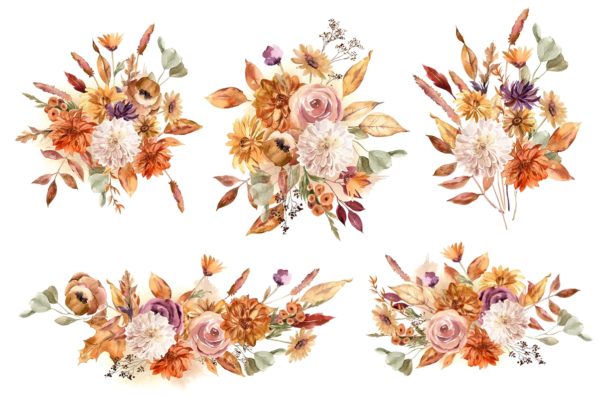Autumn Floral Clipart a set of watercolor autumn bouquets offers you beautiful and picturesque botanical compositions created in the watercolor technique. Each bouquet features a variety of autumn flowers, leaves, and berries that capture the essence of warm autumn days. This collection is perfect for use in graphic design, cards, invitations, and other projects where you want to add autumn charm and delicacy. Let your imagination run wild and create stunning and unique compositions with this set of watercolor autumn bouquets.