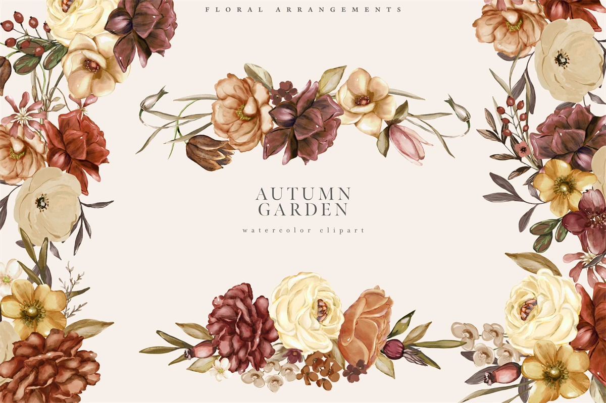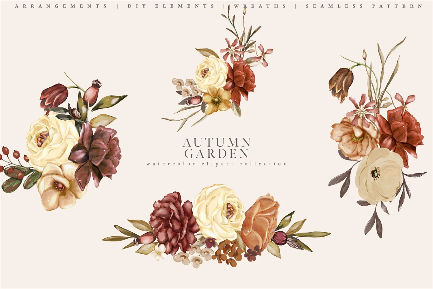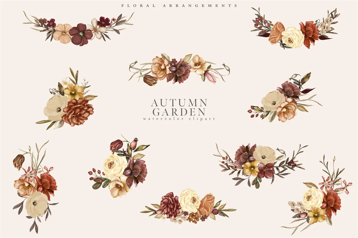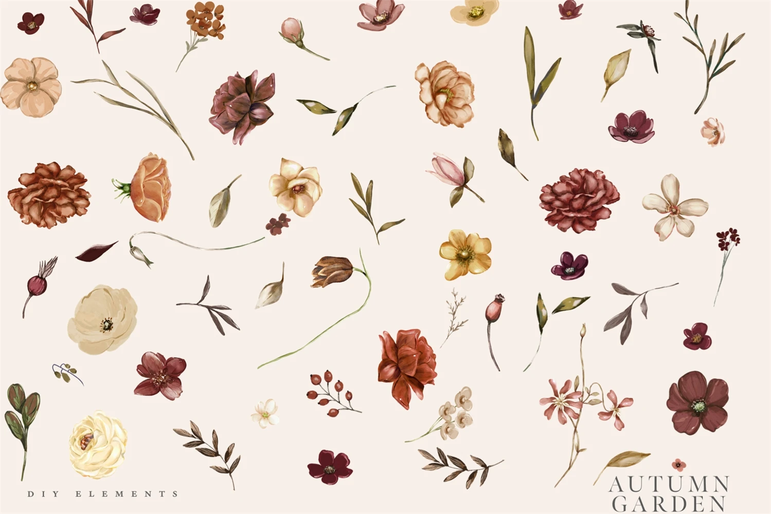 This Autumn watercolor floral clipart featuring flowers, leaves can easily evoke the colors and motifs associated with the autumn season. These clipart images can be used for various creative purposes, such as designing invitations, greeting cards, posters, or other artistic projects that require a touch of nature-inspired beauty with a fall theme.