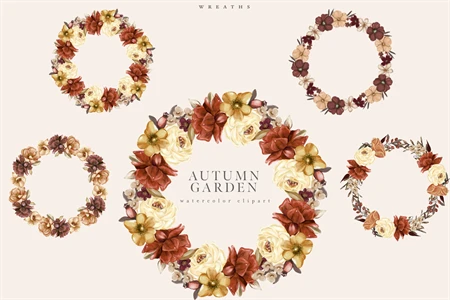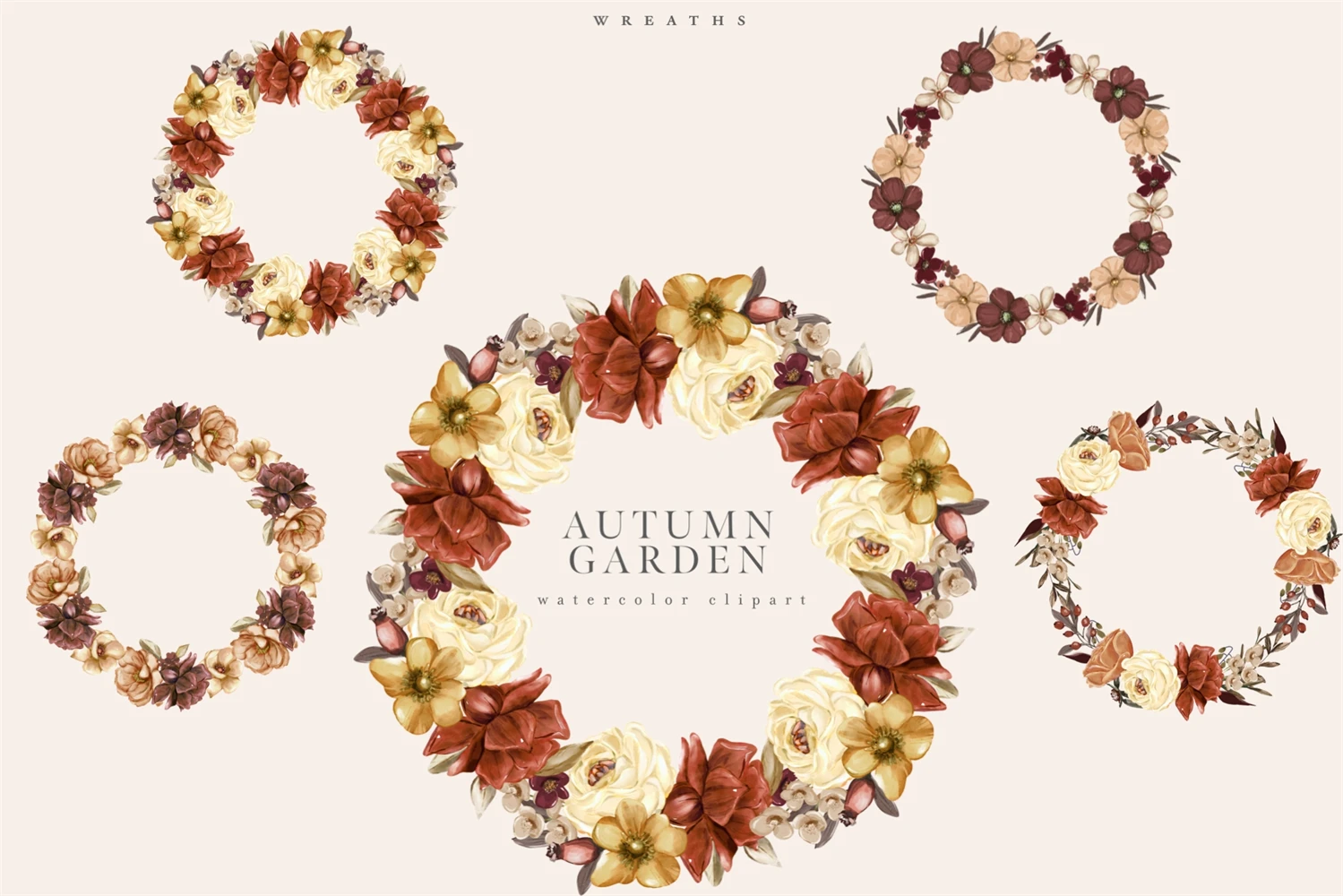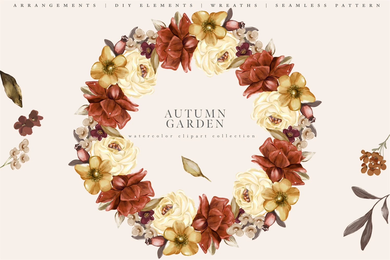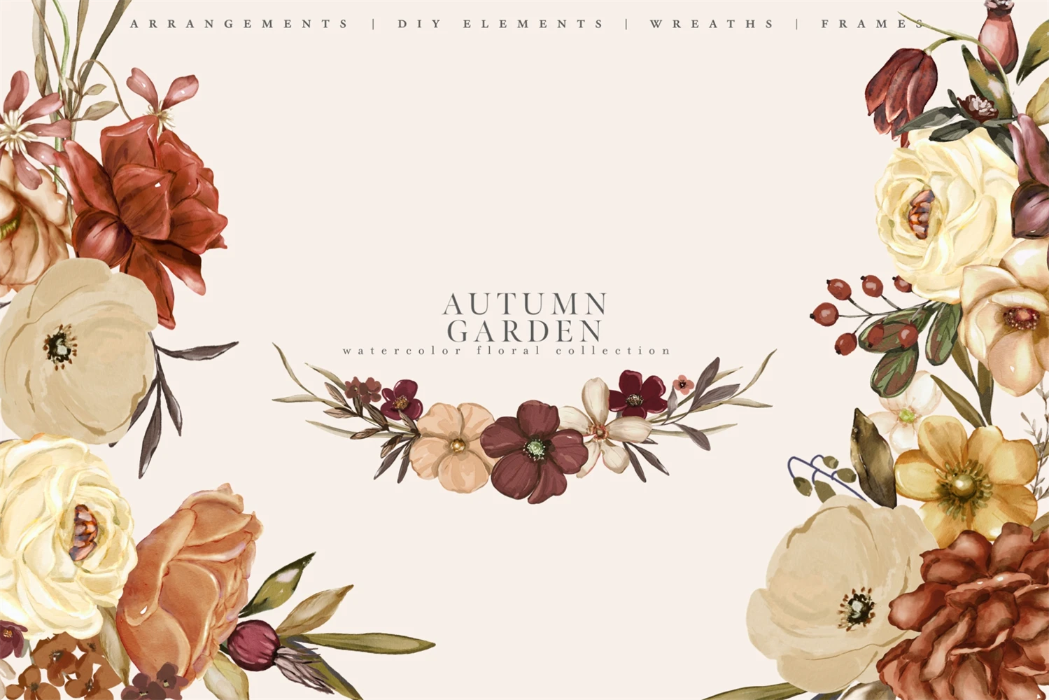 This Autumn watercolor floral clipart featuring flowers, leaves can easily evoke the colors and motifs associated with the autumn season. These clipart images can be used for various creative purposes, such as designing invitations, greeting cards, posters, or other artistic projects that require a touch of nature-inspired beauty with a fall theme.
