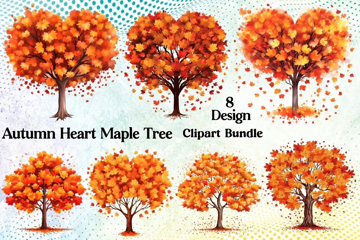 Watercolor Autumn Heart Maple Tree Clipart PNG Bundle
