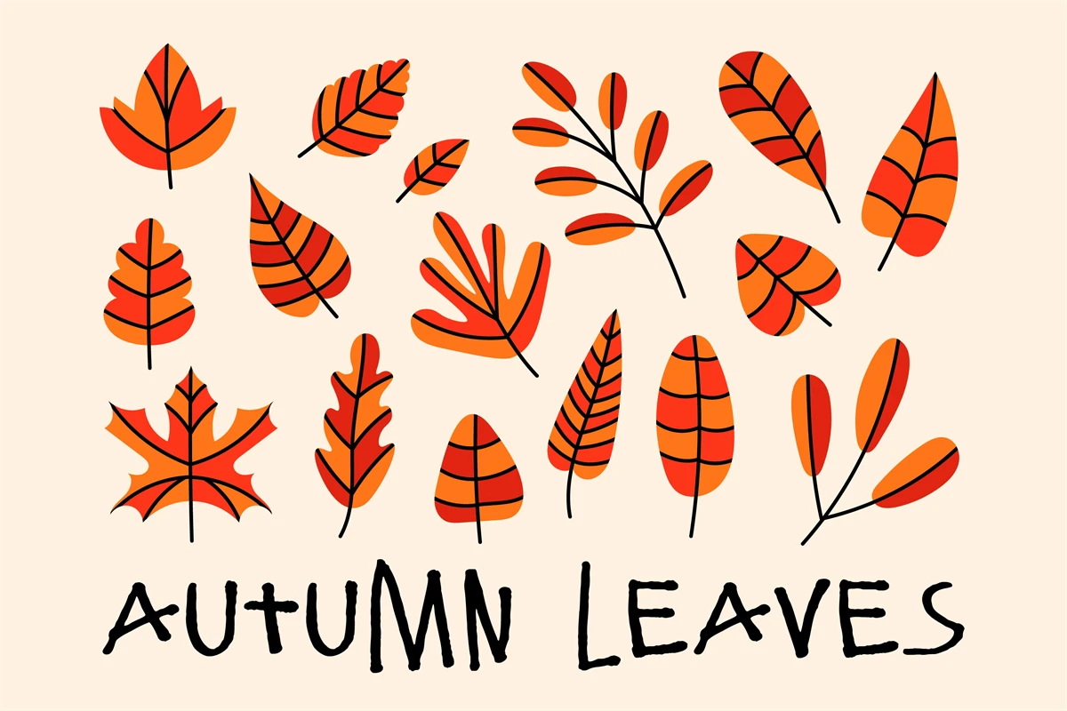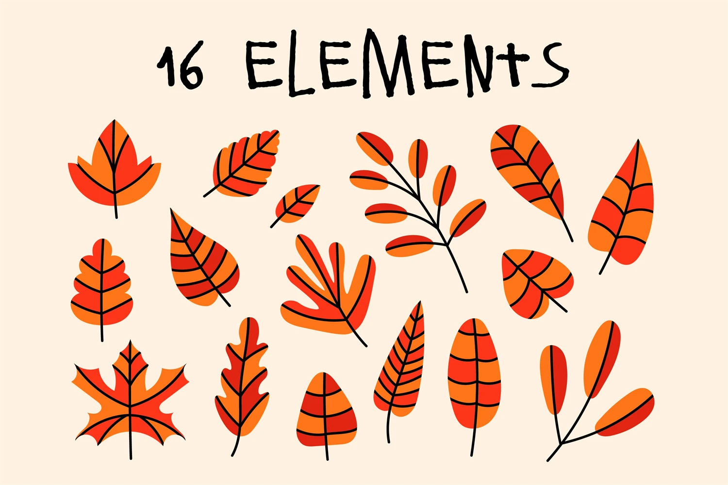 Hand-drawn orange and red leaves collection. Foliage doodles. Vector illustration for fall and autumn seasonal design. Doodle style.