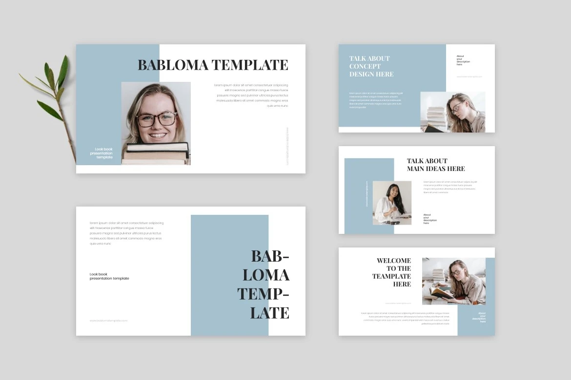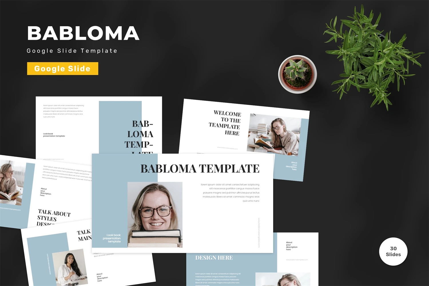 Get it now! **Babloma - Google Slide Template** for All Business and Personal Needs All elements on this template are editable; input your content, replace your image with a placeholder, change the color, and all presentations include an animated slide to present your slides.