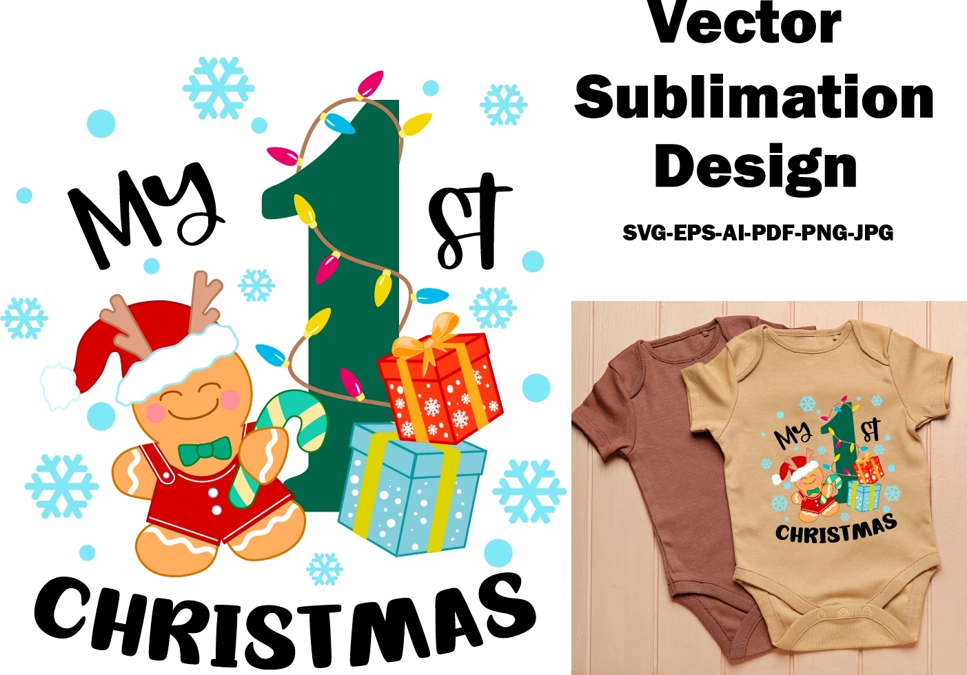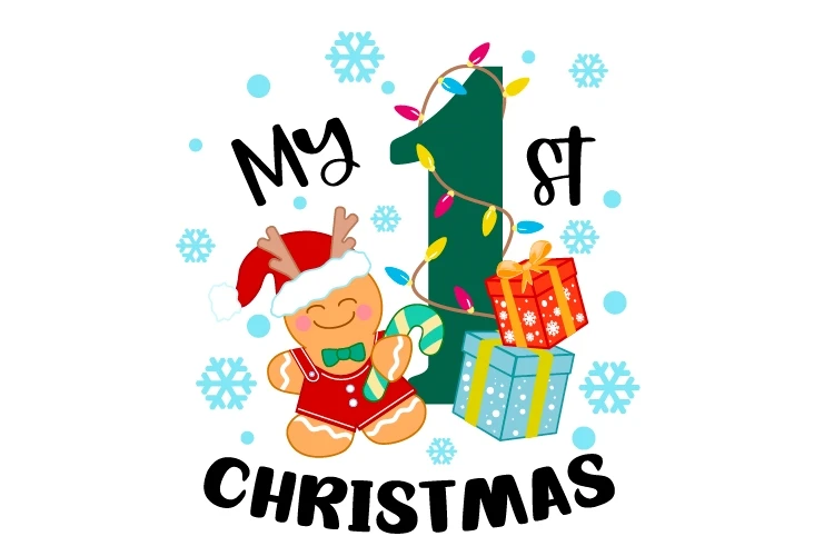 My First Christmas. Baby First Christmas T-Shirt Design. Gingerbread Man with Santa Claus hat with gifts